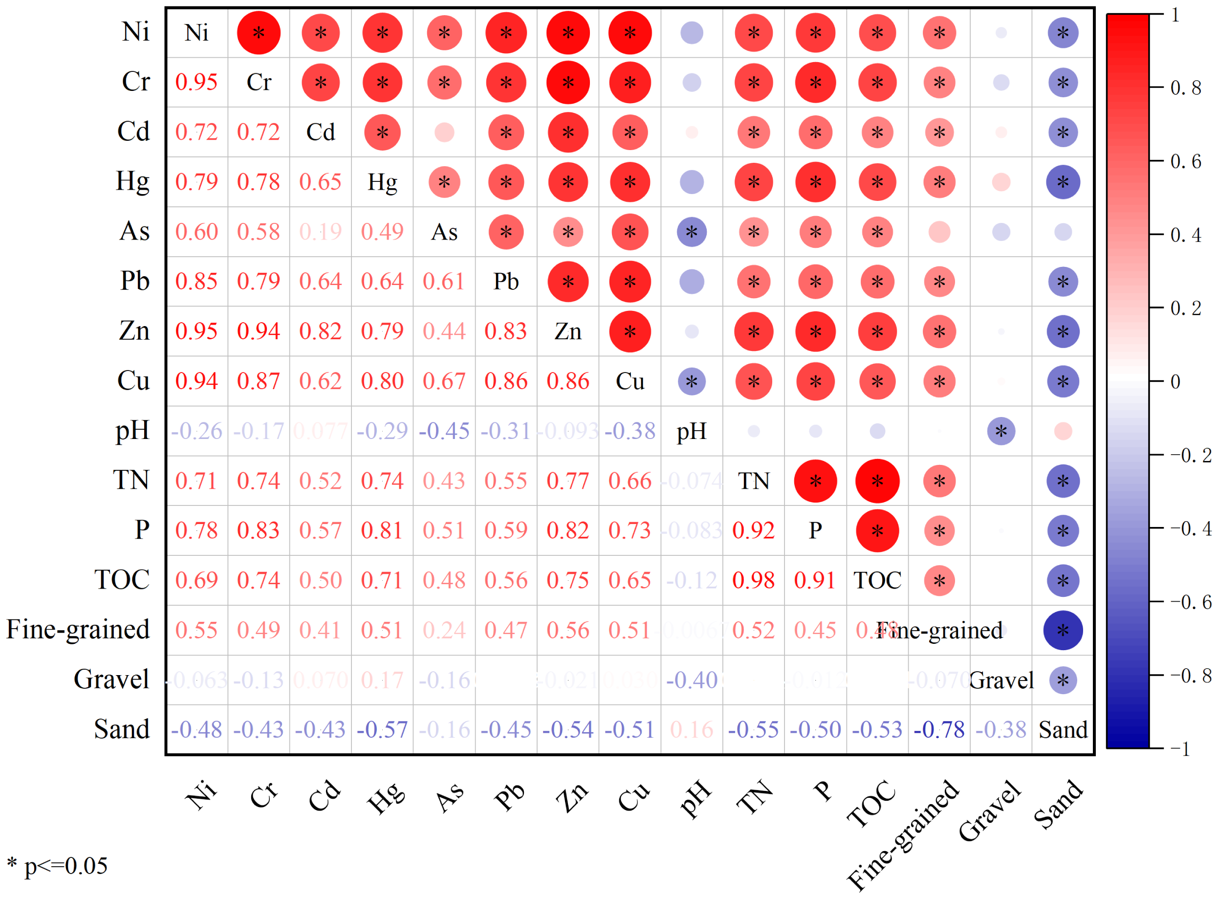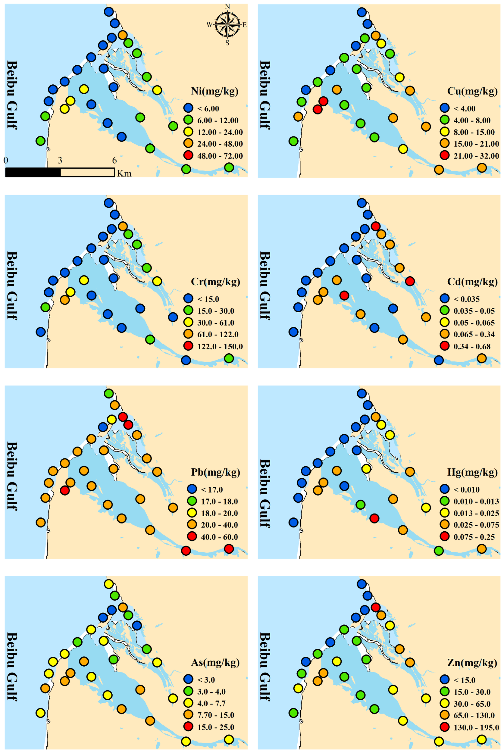The sediment samples collected in this study were analyzed at the Analytical Testing Laboratory of the Haikou Marine Geological Survey Center. Before measurement, the samples were air-dried, ground, and sieved through a 160-mesh sieve, followed by microwave digestion to prepare the test solutions. The concentrations of Ni, Cu, and Zn were measured using an X-ray fluorescence spectrometer (Axios Pw4400), while As and Hg concentrations were determined using a dual-channel atomic fluorescence spectrometer (AFS-8530). Additionally, Cr, Cd, and Pb were analyzed using an inductively coupled plasma mass spectrometer (ICP-Q). The grain size was determined according to the guidelines specified in the Specification for Marine Investigation (GB12763.1-2007, State Oceanic Administration, PR China), and sediment grain size analysis was conducted using a PSA 1190 LD laser diffraction particle size analyzer.