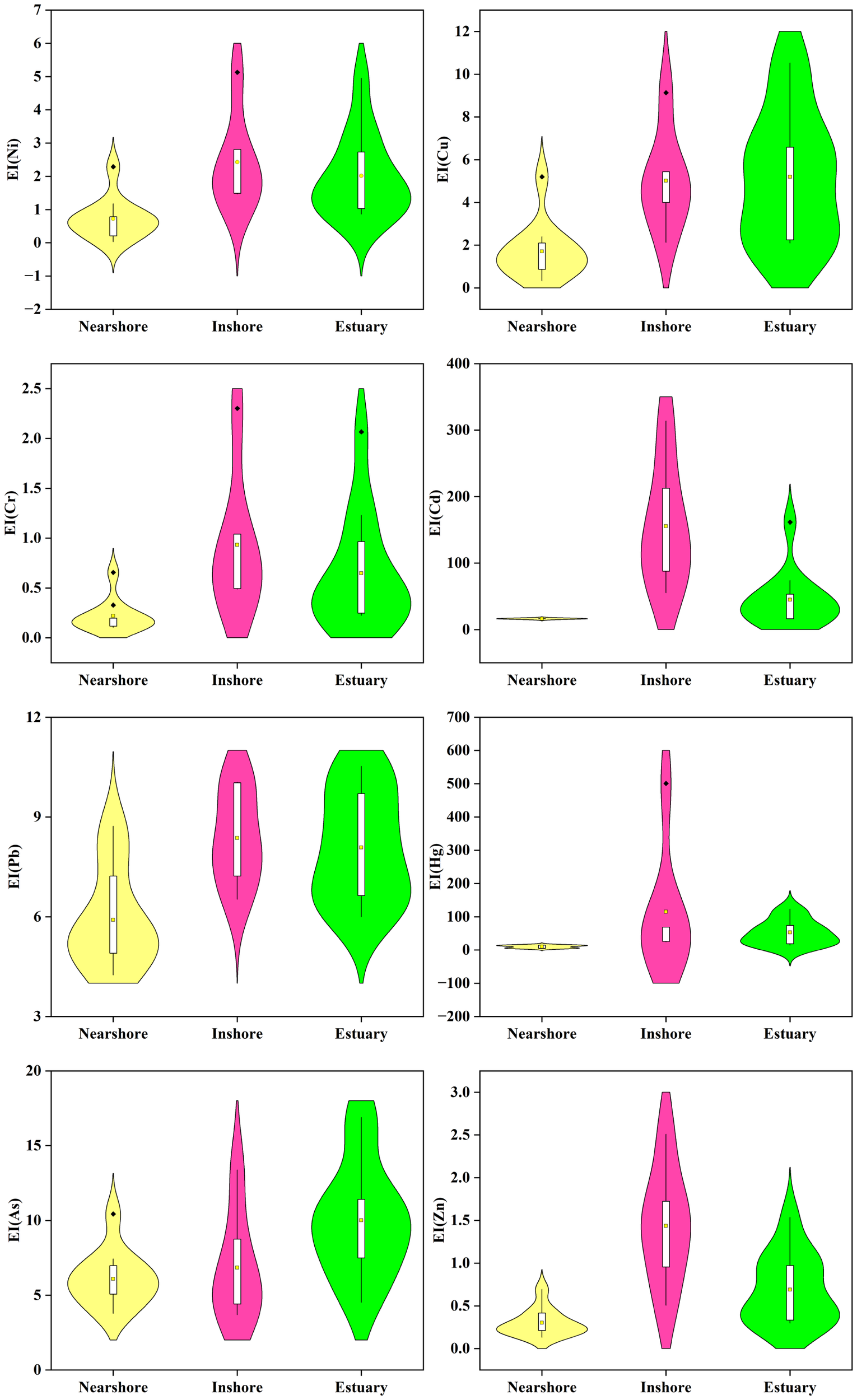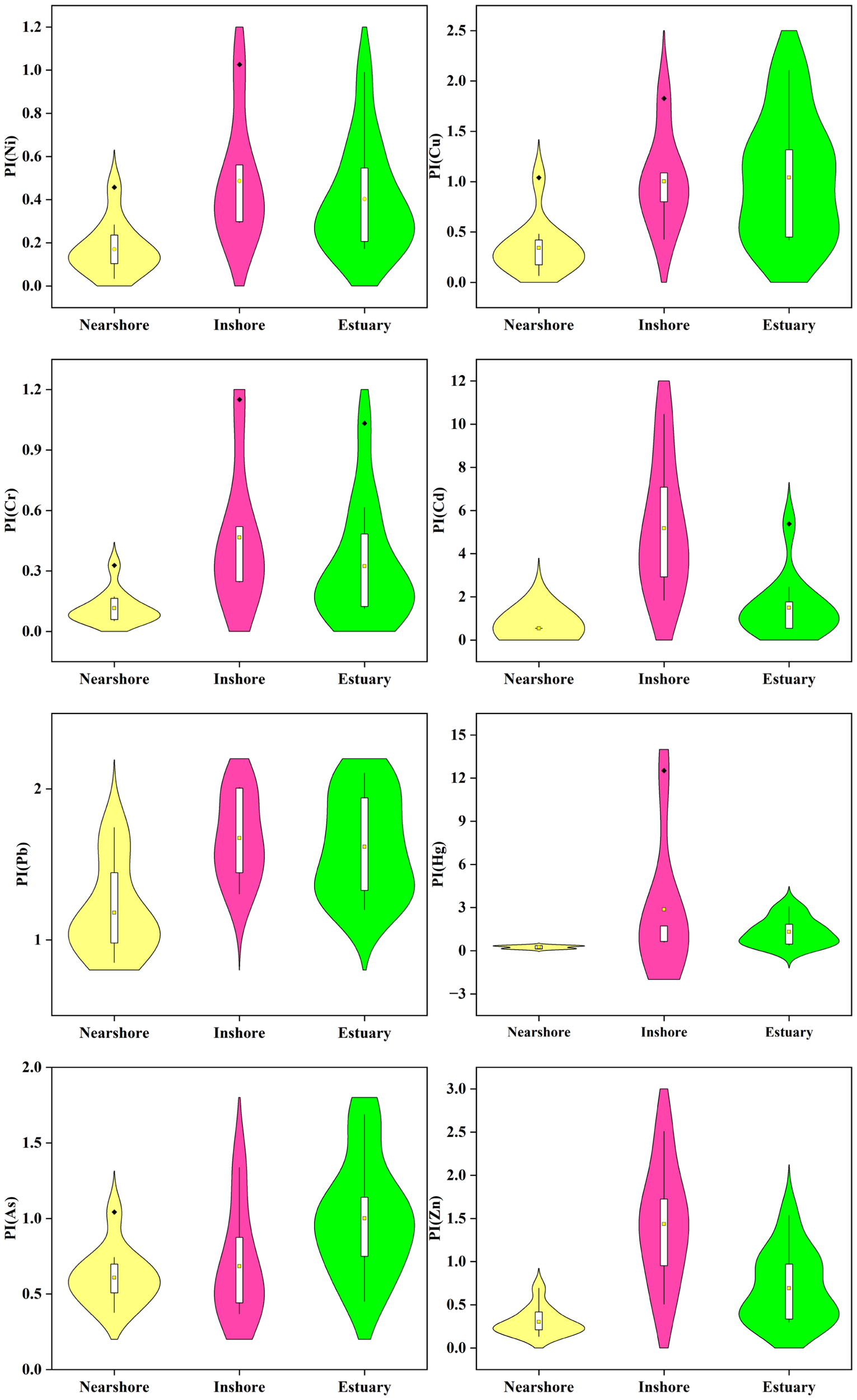 The PI values for the research region varied significantly, ranging from 0.37 to 1.69 for As, 0.54 to 10.46 for Cd, 0.05 to 1.15 for Cr, 0.07 to 2.51 for Cu, 0.12 to 12.52 for Hg, 0.03 to 1.03 for Ni, 0.85 to 2.11 for Pb, and 0.13 to 2.51 for Zn. Among these elements, Hg, Cd, Pb, Cu and Zn exhibited the greatest variability in PI values across the regions, and certain samples recorded a PI value greater than 2.0 (Figure 5). This observation indicates that the sediments in the research region are contaminated with these metallic elements.
