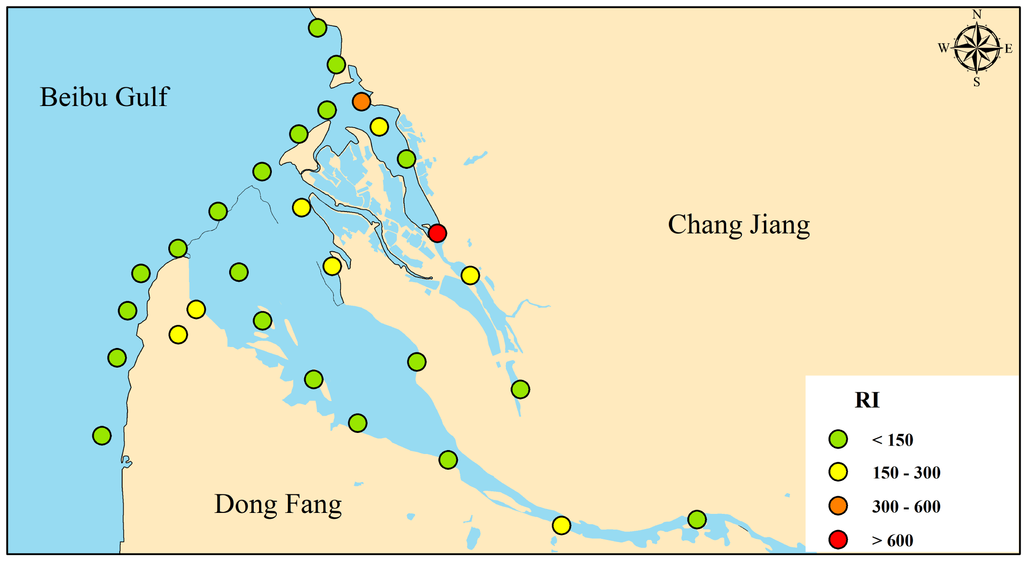 The RI index is frequently employed to assess possible environmental hazards in sediment (Hakanson, 1980). The evaluation formula is expressed as follows: