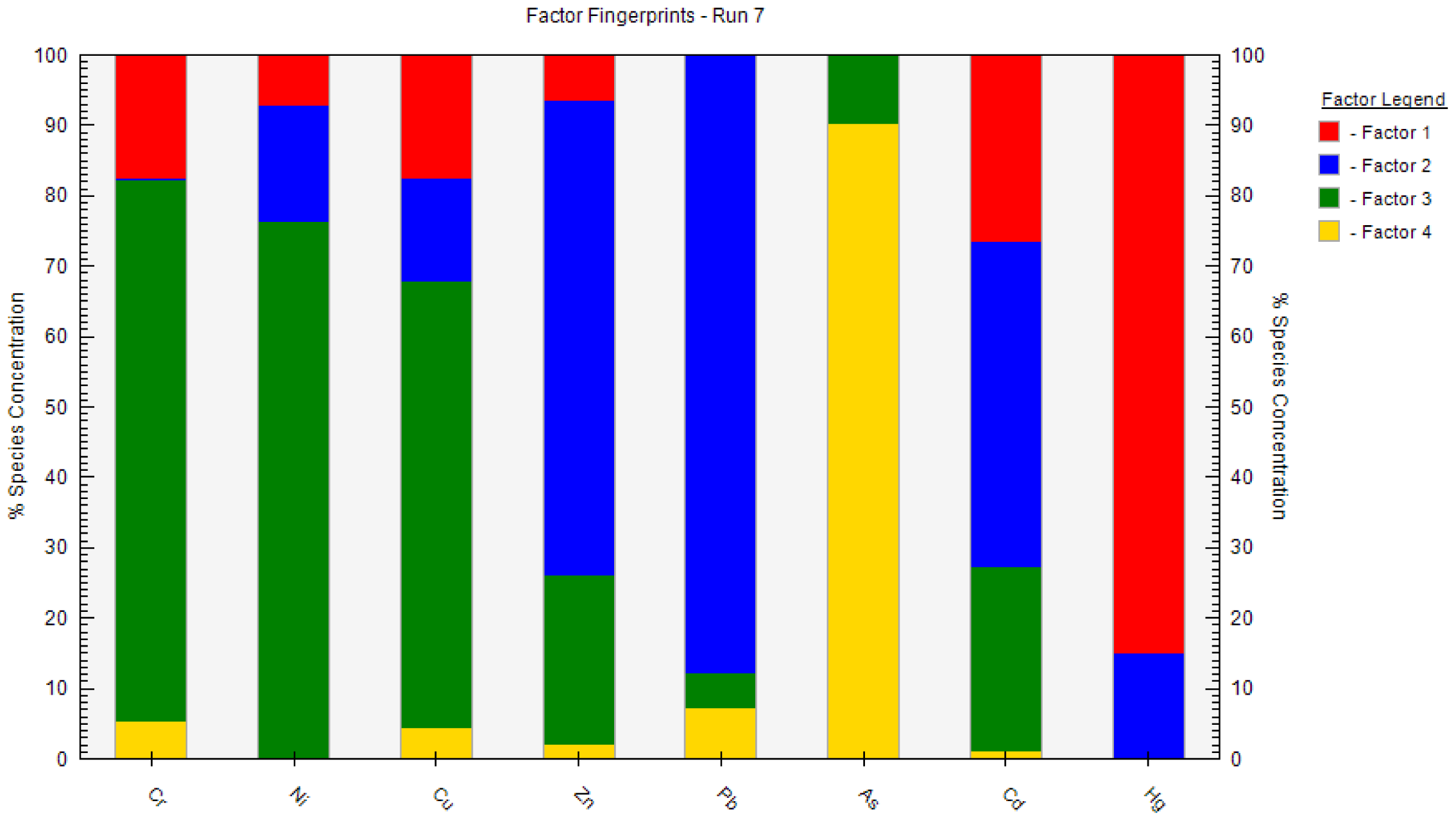 EPA PMF 5.0 is a positive definite short-matrix factorization tool developed by the United States Environmental Protection Agency, which is widely used in environmental data analysis, including atmospheric particulate matter, water quality and sediment. The model decompositions the observed environmental data into a factor contribution matrix and a factor spectrum matrix. Helps identify potential sources of pollution and quantify their contribution to pollutant concentrations in the environment. In addition, it is a multivariate factor analysis technique, employs the least iterative squares algorithm (Vaccaro et al., 2007). Unlike other methods, it does not necessitate predefined source or receptor component spectra. During factorization, error estimation is applied to individual data points, enhancing the treatment of missing or erroneous data. This method avoids generating negative values in matrix decomposition, thereby improving result reliability (Yu et al., 2021). The PMF model breaks down the original receptor data matrix (X) into three components: a factor score matrix (G), a factor loading matrix (F), and a residual matrix (E) (Norris et al., 2014). The equation for this decomposition can be expressed as follows: