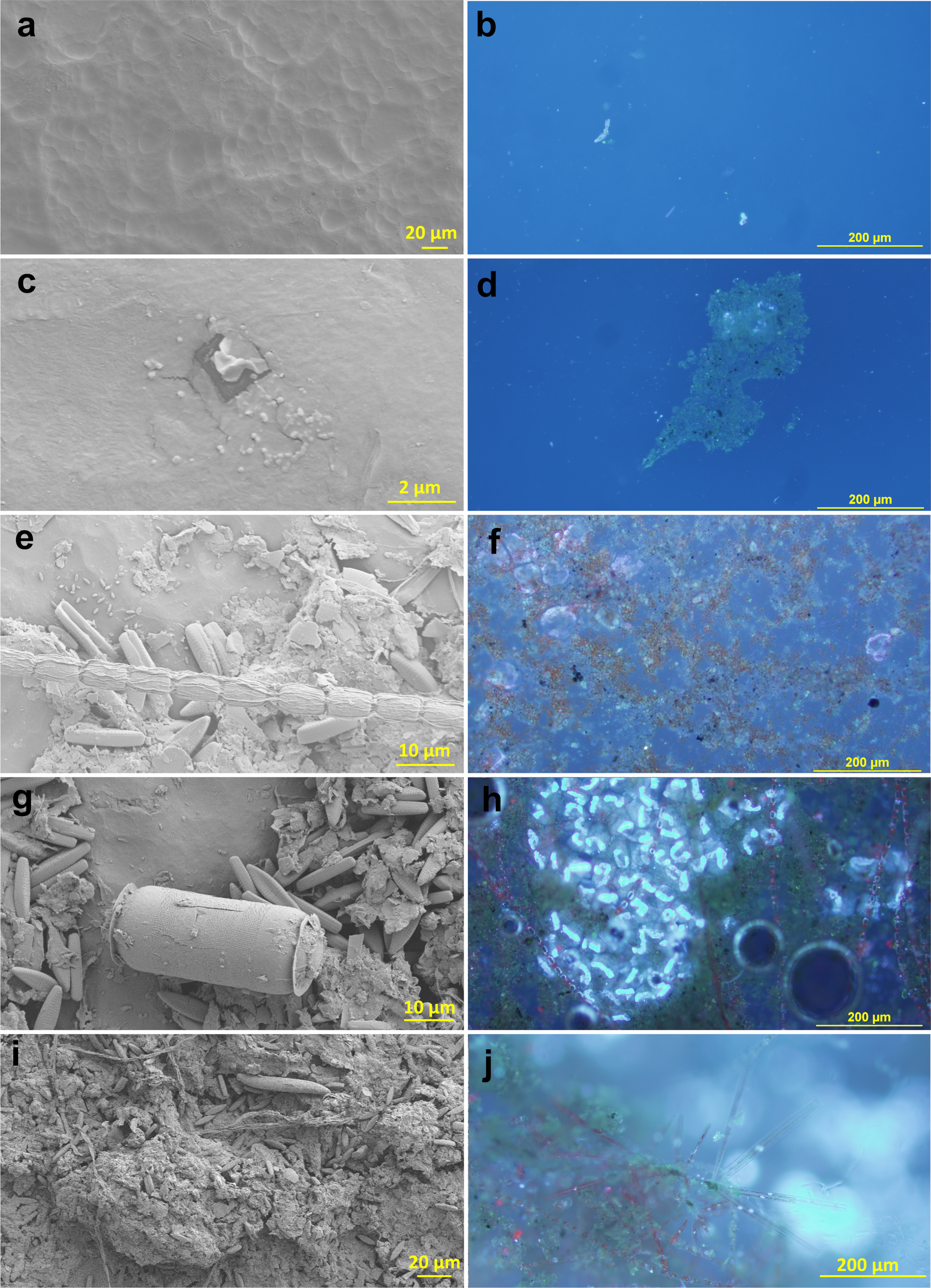 Biofilm on in-situ incubated plastics visualized with scanning electron microscopy (left) and epifluorescence microscopy (DAPI stain) (right) at 24 hours (a, b), 1 week (c, d), 3 weeks (e, f), 5 weeks (g, h), and 7 weeks (i, j).