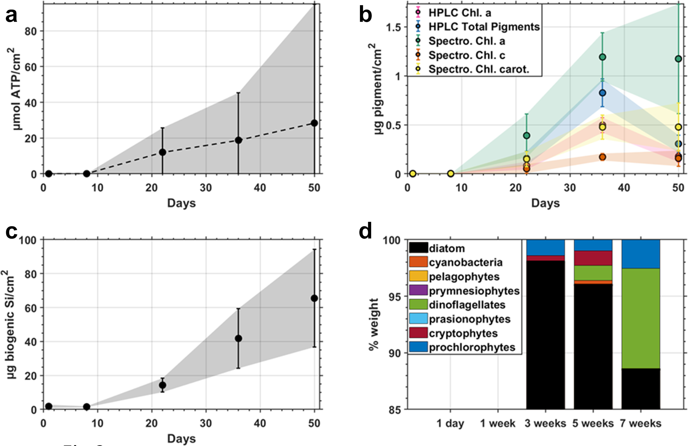 (a) ATP concentrations of field incubated biofilms normalized to the surface area of plastic with standard deviation shaded, (b) Photosynthetic pigments (c) Biogenic silica, and (d) Photoautotrophic community proportions by weight determined by HPLC pigments.