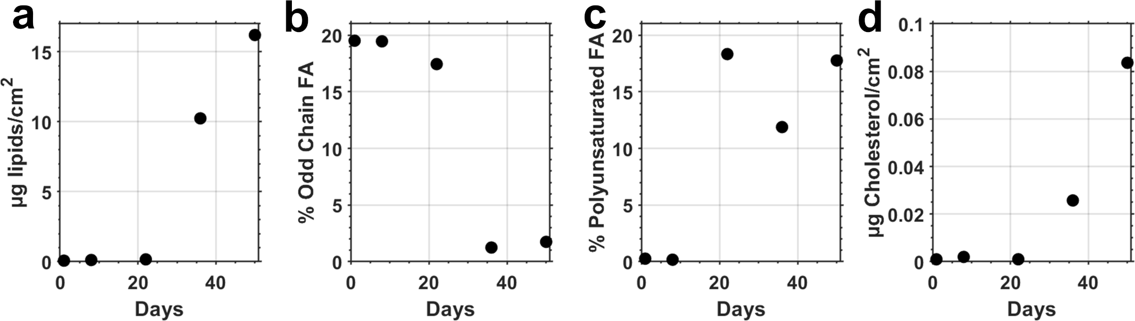 Total extracted lipids during the first 3 weeks remained below 0.2 µg/cm2 and increased to 16.2 µg/cm2 by week 5 (Figure 4a, Supplementary Figure 2). Odd chain fatty acid concentrations accounted for nearly ~20% of total lipids during the initial three weeks, then decreased by an order of magnitude proportionally for the remainder of the experiment (Figure 4b).