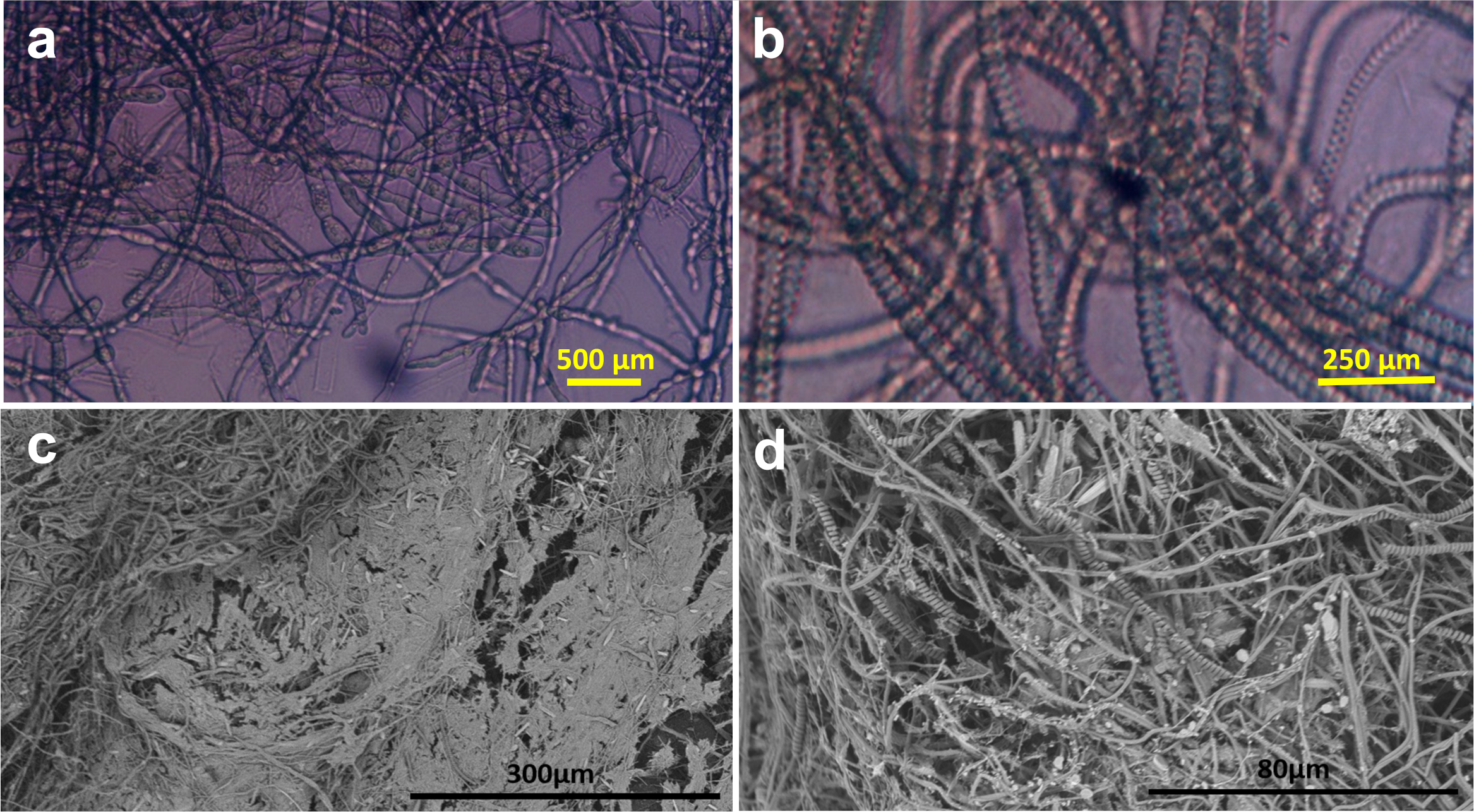 Laboratory incubation experiment with plastic disks. (a) Fungal colonies were found in the unamended estuarine water (inverted microscope). (b) Cyanobacterial chains found in f/2+ enriched water (inverted microscope). (c) Biofilm grown in silica-enriched water (SEM). (d) As in c at higher magnification (SEM).