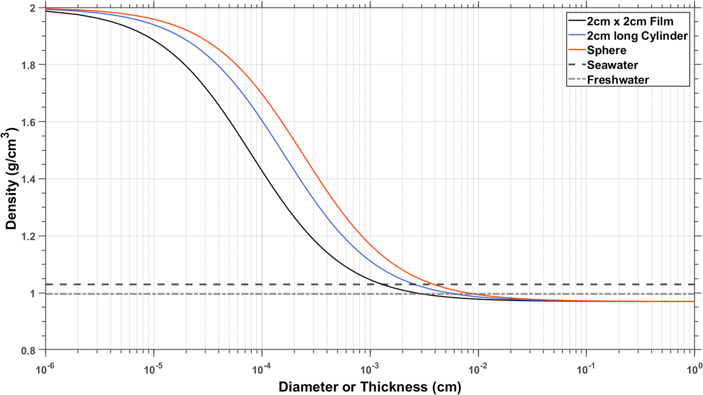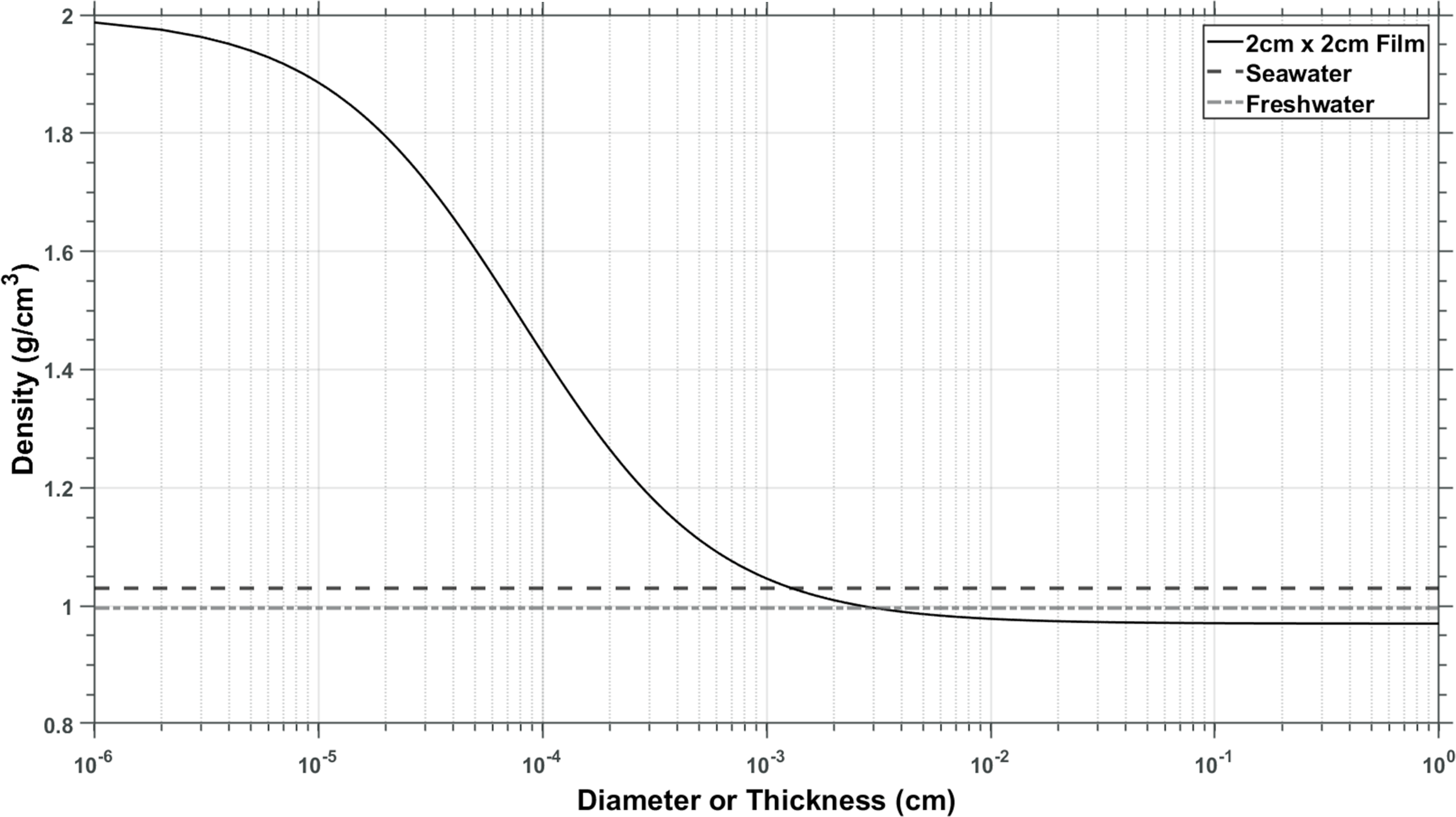 Densities of UHMWDPE plastic at various thicknesses using the maximum observed biogenic silica accumulation during the field incubations (at week 7). If the plastic is very thin, biofilm dominates, and density is close to that of biogenic silica (left side of the figure). The thicker the sheet, the more its density is influenced by the density of the plastic (right side of the graph). Plastic of this density needs to be thinner than plastic wrap to become negatively buoyant in water assuming the existence of the maximum observed biofilm on both sides.