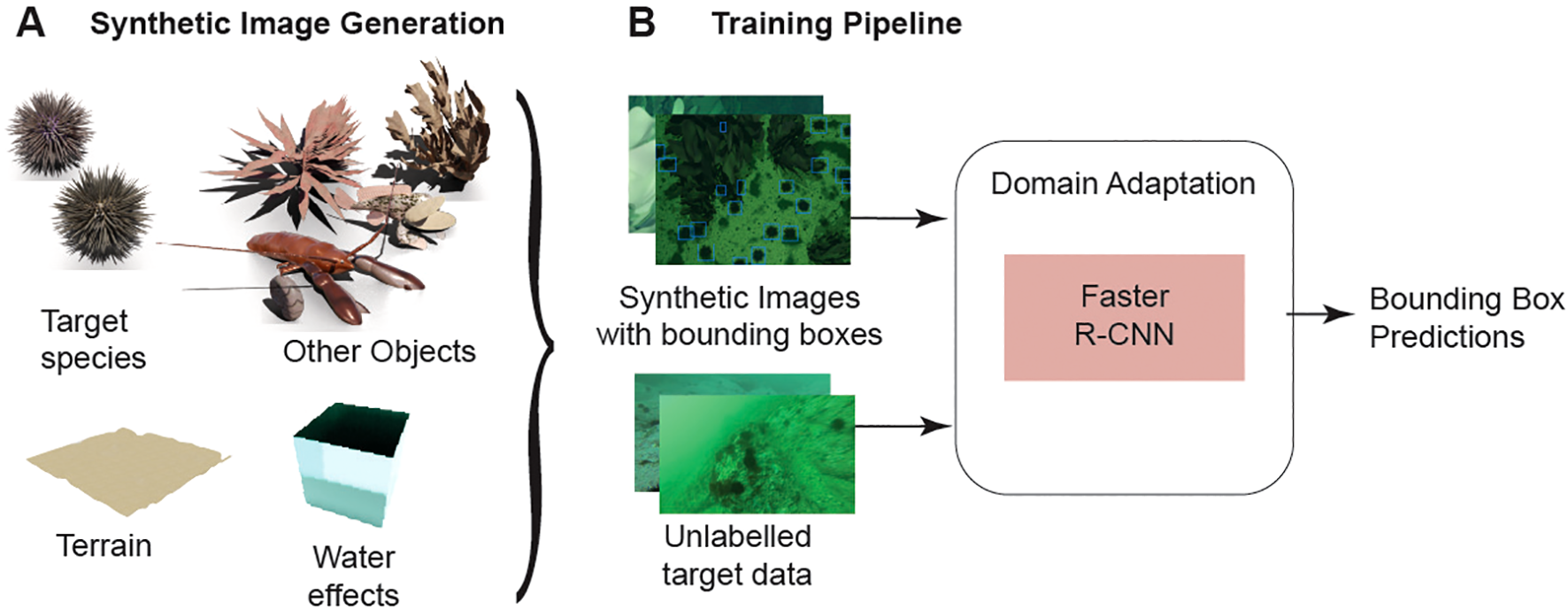 Overview of our method. (A) 3D models of marine objects, terrain and water are combined to create a unique scene for generating images and annotations. The training pipeline (B) uses the labelled synthetic data and real unlabelled target images to train the object detector with domain adaptation.