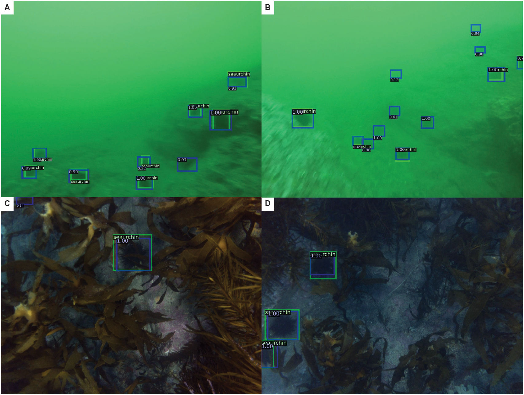 Examples of the target images with ground truth shown with a green border with the label ‘seaurchin’ and predictions in blue with the probability. (A, B) are from the UDD dataset, and (C, D) are from the IMOS AUV dataset.