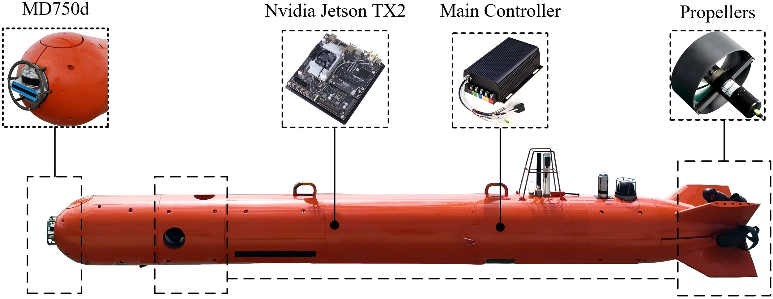 In primary work (Xu et al., 2023; Yang et al., 2023), we built an AUV that can be used for underwater archaeological surveys. As shown in Figure 2, an Oculus MD750d forward-looking sonar is integrated for data collection. This sonar has two operating frequency bands. The high-frequency mode offers higher data resolution but a shorter range, whereas the low-frequency mode is the contrary. The AUV cruised at a speed of 0.5m/s and maintained a fixed depth to acquire stable sonar images. During data acquisition, the pitch and roll angles of the AUV are both less than ±3°. In contrast to the clarity of images, the obstacle detection task pays more attention to the spatial scope of the image, therefore, we use the frequency of 750kHz to achieve a larger detection range. The sonar range was set to 100 meters.