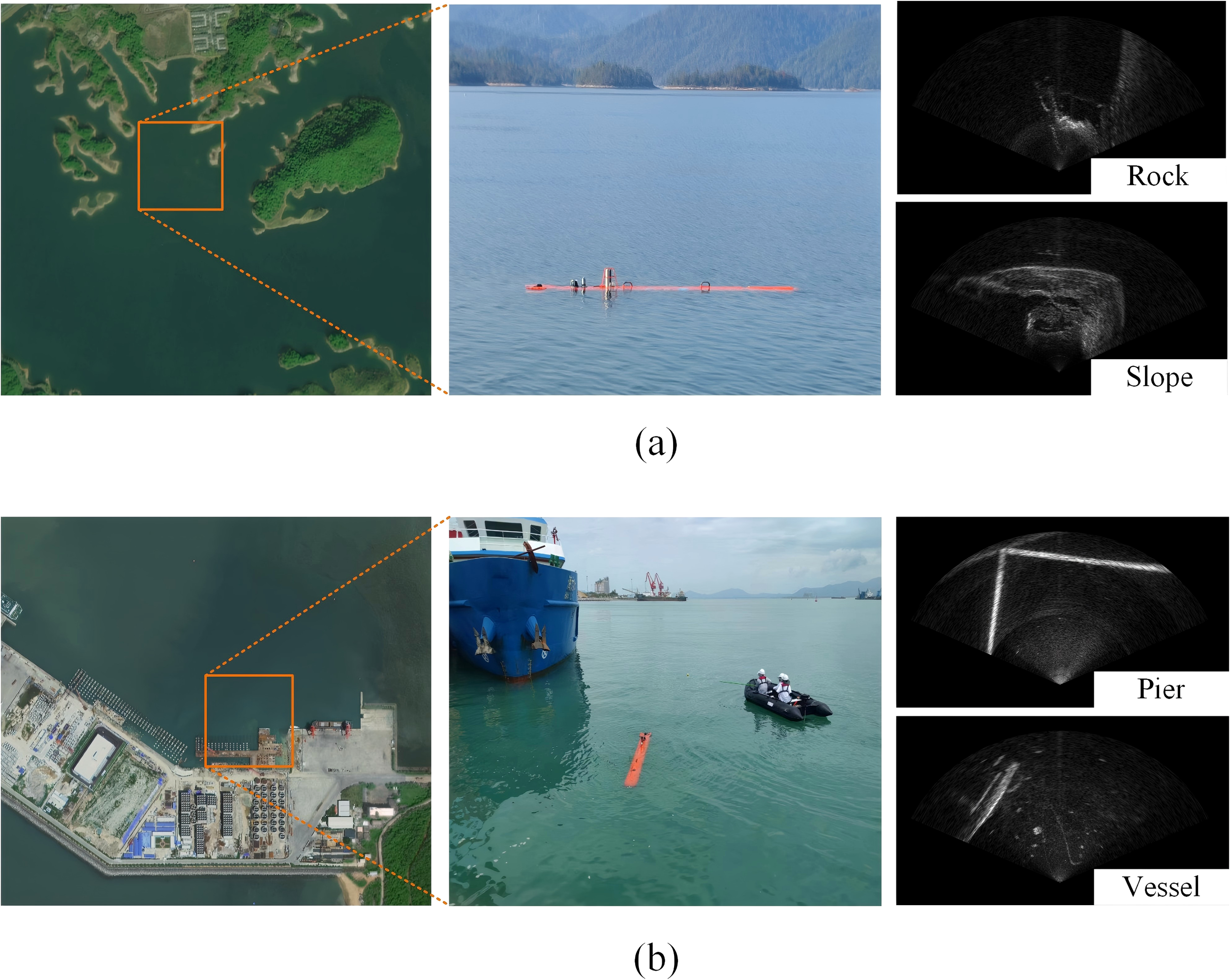 We collected more than 5000 forward-looking sonar images from two distinct locations in China: Qiandao Lake in Zhejiang Province and Nanshan Harbor in Hainan Province. These locations were carefully selected to ensure diversity in the dataset, representing both structured and unstructured underwater environments. As shown in Figure 3, the sonar images collected in Qiandao Lake contain rocks and slopes, while the images obtained in Nanshan Harbor include piers and vessels. By incorporating these varied environments, the dataset encompasses a broad spectrum of obstacle types, enhancing its applicability to real-world underwater navigation scenarios. Structured obstacles, such as piers and vessels, have defined geometric shapes and predictable sonar reflections, whereas unstructured obstacles, like rocks and sloped surfaces, exhibit irregular contours and varying sonar signatures. The combination of these elements contributes to a more comprehensive dataset, enabling underwater robots to handle diverse navigational challenges effectively.