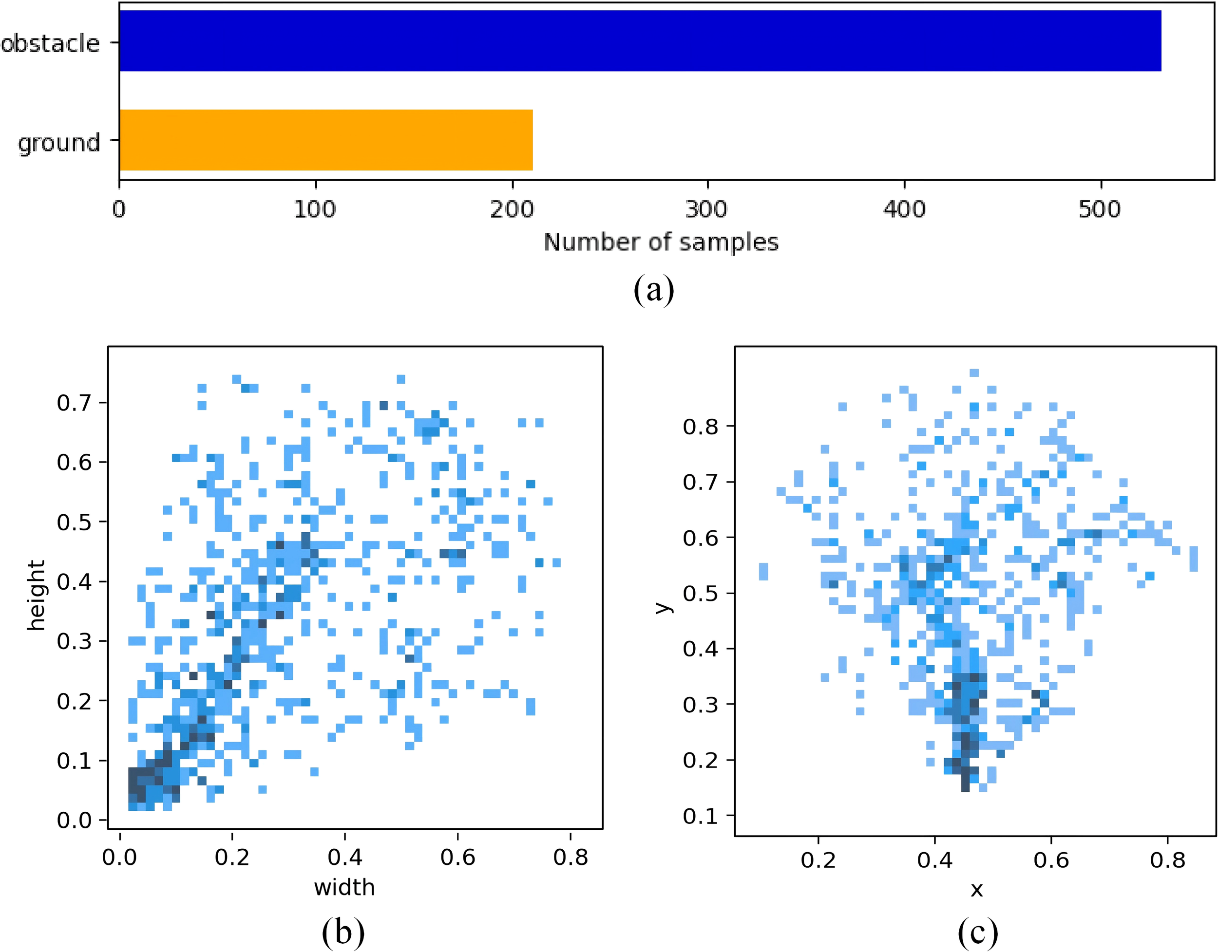 Sample distribution of the dataset. (a) Quantity of samples. (b) Size of samples. (c) Position of samples.
