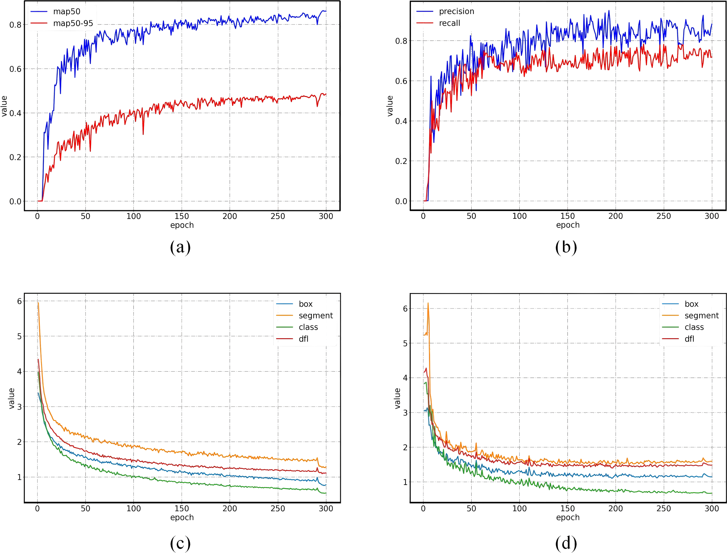 Even the smallest version of YOLOv8 network still contains a large number of parameters. Besides, taking the YOLOv8n network (the smallest variant) as an illustration, the PAN module contains a considerable proportion of parameters (24.55%), as well as the Predict head (27.94%). These components contain a large number of parameters but produce only low-dimensional and abstract semantic information for segmentation, such as classes, bounding boxes, and mask coefficients, which affect the network’s speed. This study adopts YOLOv8n as the baseline model due to its highly lightweight architecture.
