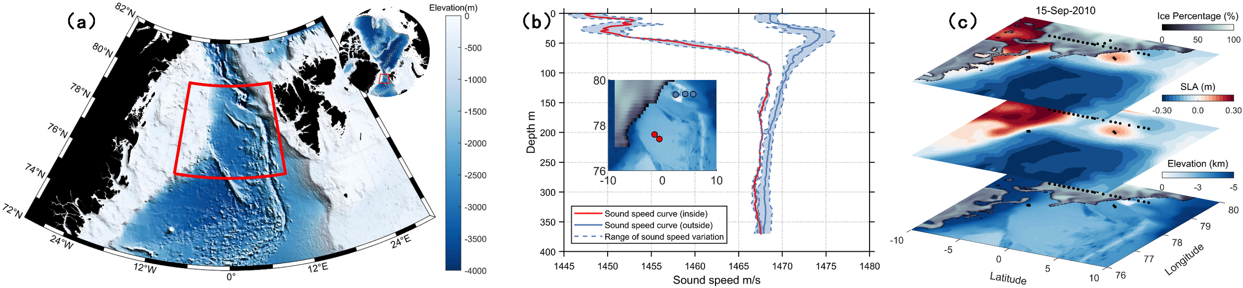 (a) The map of the Fram Strait region, the red box is the area we study. (b) The red and blue dots are five observation stations of the ACOBAR project in the ice-free region. The solid red and blue curves show the corresponding mean sound speed profiles (SSPs), while the blue dashed curves illustrate the range of sound speed variability. (c) Sea ice, sea surface level anomaly (SLA), and seafloor topography in the study area on September 15, 2010. The black dots represent all the observation stations in ACOBAR project. The top layer represents the combination of sea ice (Black-White color) and SLA (Blue-Red color); the middle layer represents the SLA, and the lower layer represents the seafloor topography (White-Blue color).