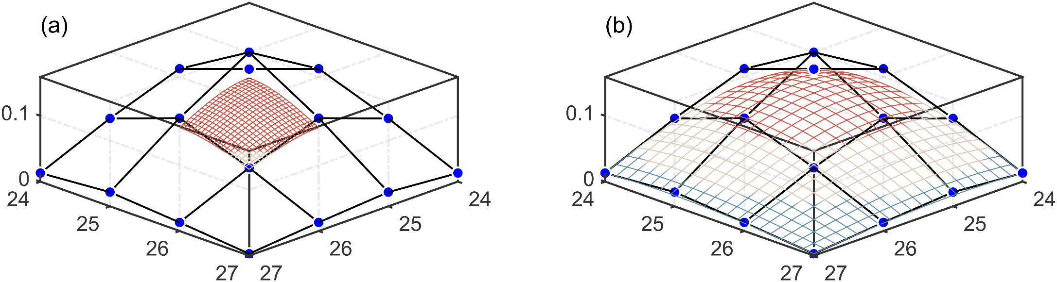 Two categories of B-spline surfaces. Blue dots represent control points, which, together with the black mesh, form the control lattice that defines the B-spline surface. (a) Uniform B-spline surface. (b) Quasi-uniform B-spline surface.