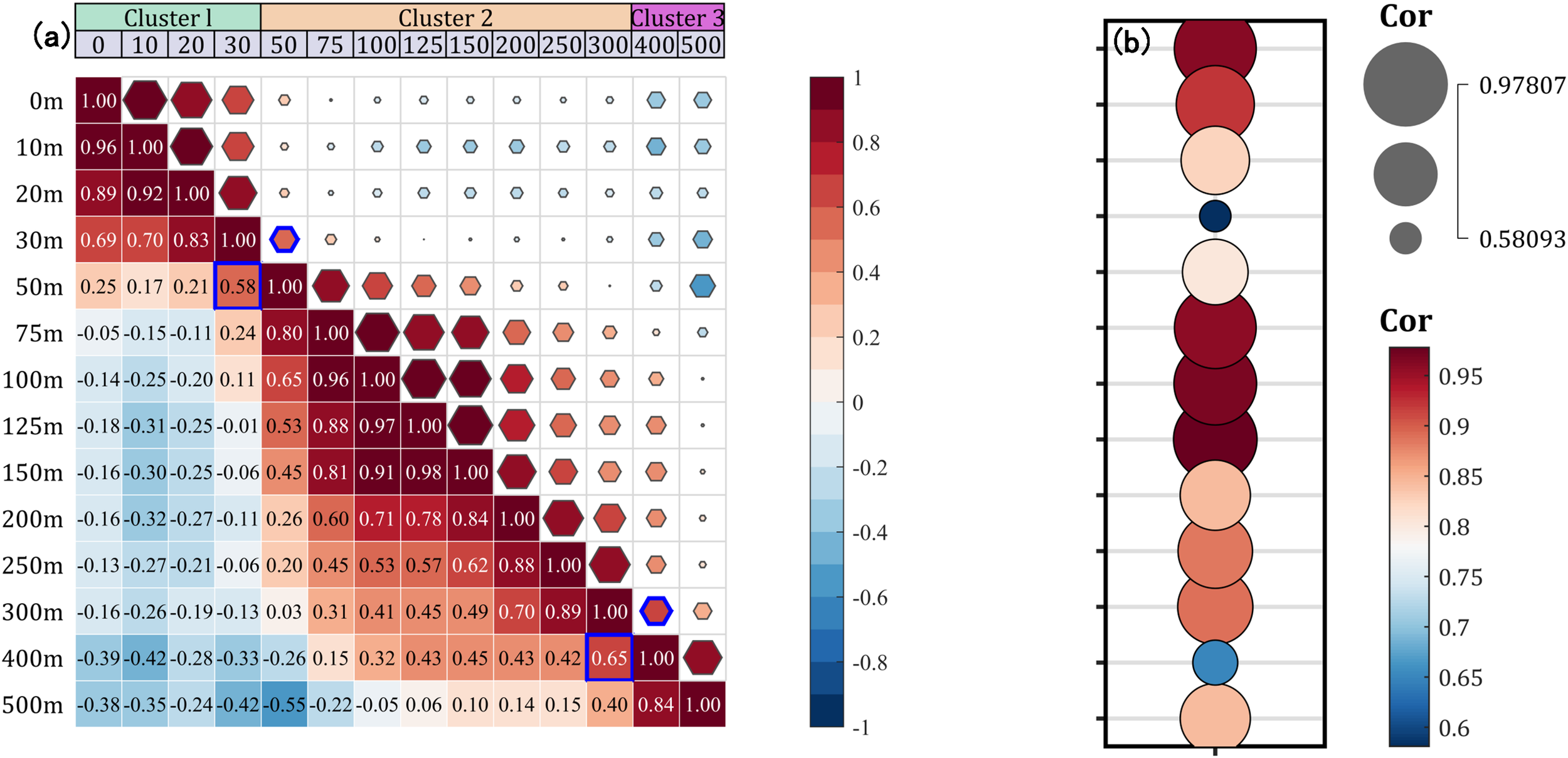 (a) Spearman correlation coefficient of SSA at different depths. The blue polygon highlights the location of two adjacent water masses with the weakest correlation. (b) Correlation strength between adjacent water layers. Larger and darker bubbles indicate stronger correlations between adjacent water masses.