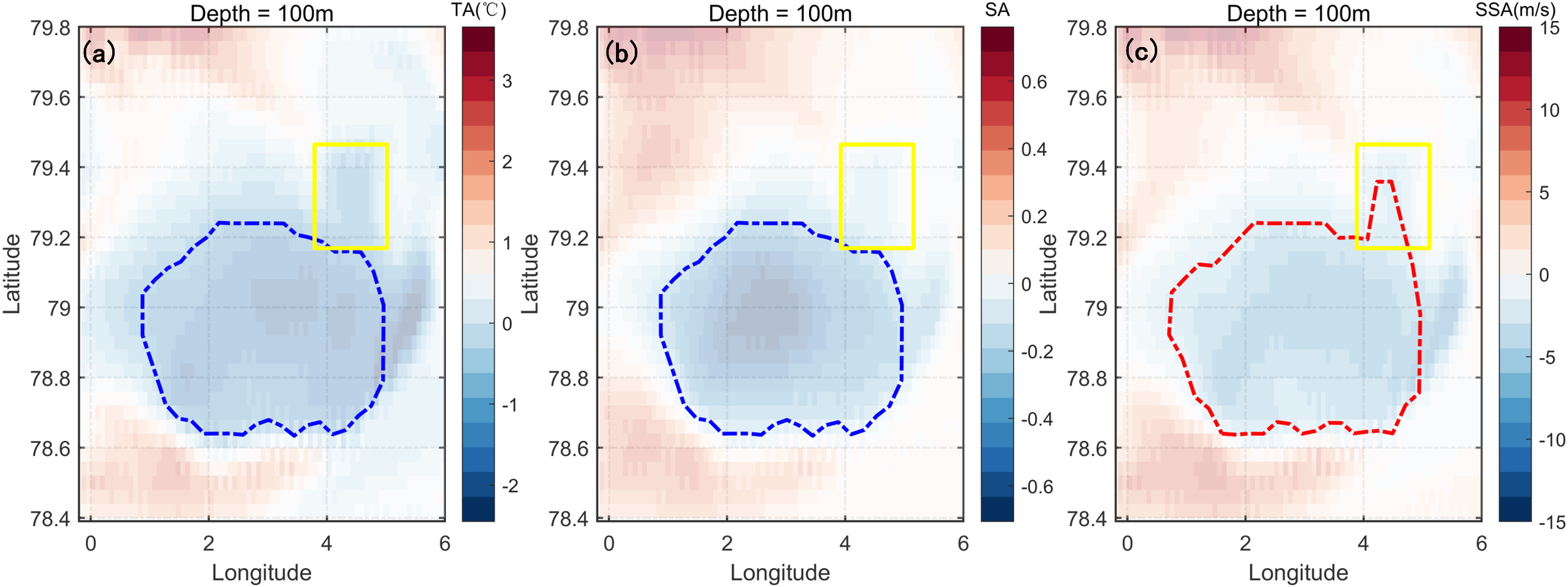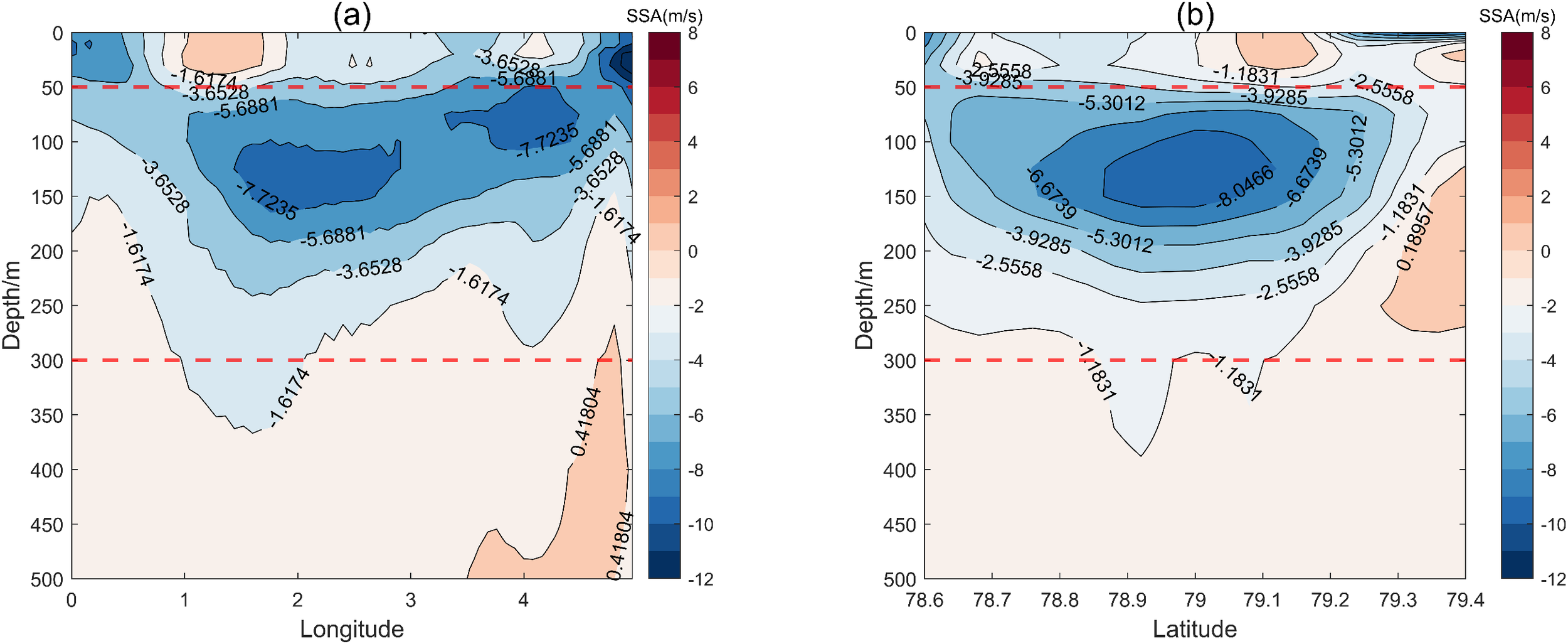 Profile of the negative-SSAE. The region enclosed by the red dotted line represents the vertical SSA core area. (a) Latitude = 78.32: Latitudinal cross-section of the eddy. (b) Longitude = 2.32: Longitudinal cross-section of the eddy.