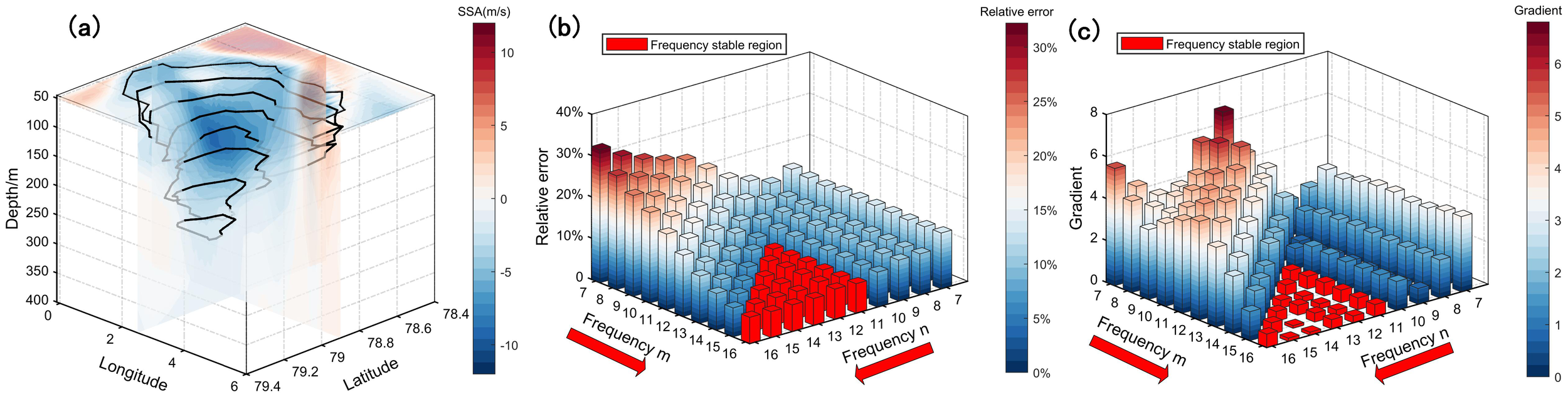 (a) Boundaries of the SSA core area at different depths. The solid black lines indicate the boundaries, while the background shows the SSA field. (b, c) Results of cross-validation: (b) relative error and (c) relative error gradient, represented by height and color, respectively. The red bar highlights the frequency stable region where both error and gradient change smoothly.