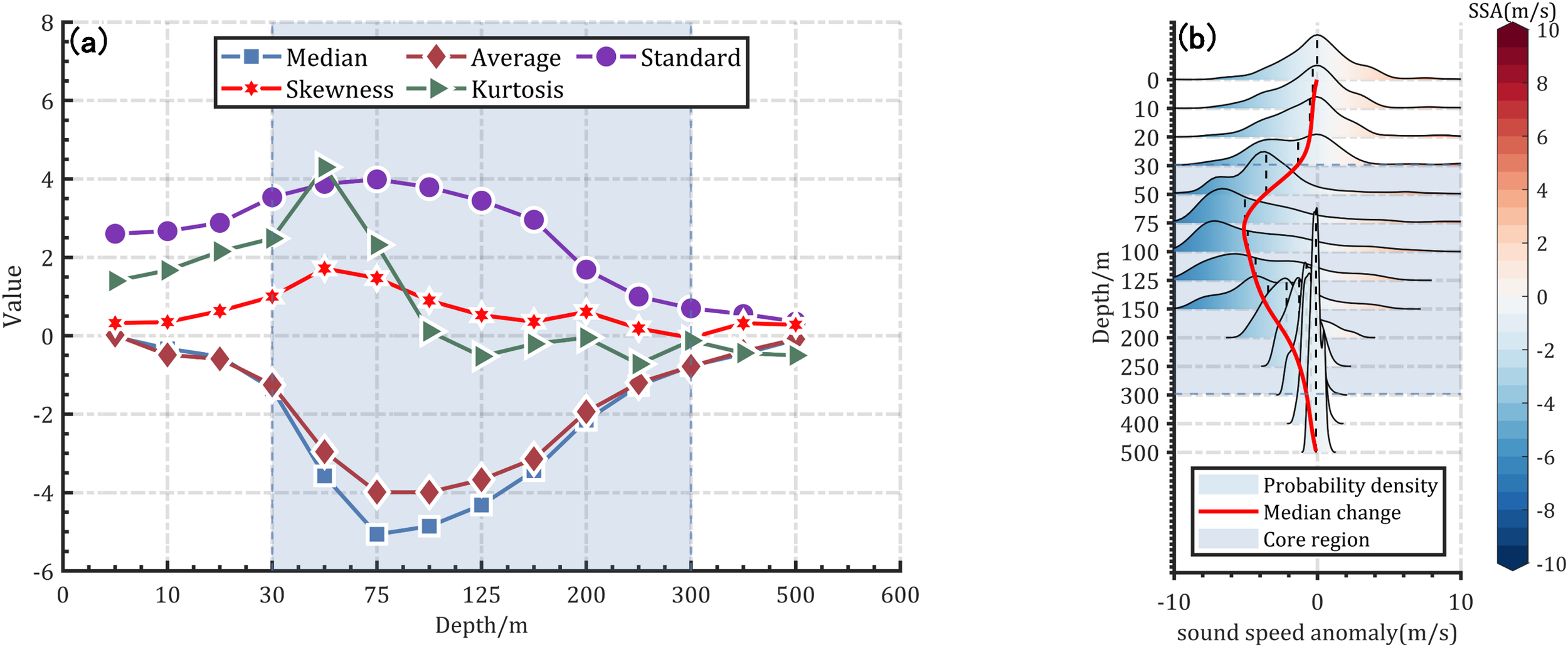 First, we analyzed the SSA data at different depths. To characterize the central tendency, dispersion, and distribution of the SSA data, we calculated the median, mean, standard deviation, skewness, and kurtosis, thereby obtaining the statistical properties of the SSA at various depths, as shown in Figure 9.