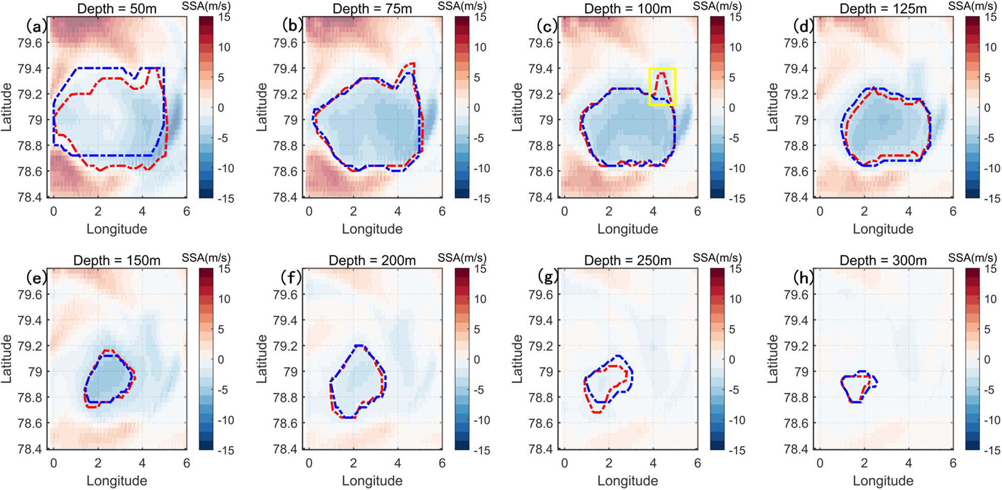 As illustrated, the B-spline surface provides a reliable representation of the negative SSAE. The reconstructed eddy tilts southwestward with increasing depth, and its boundary encompasses all SSA values greater than 6 m/s (indicated by the yellow to red regions in Figure 8). Additionally, an SSA core region is observed near the 4°E profile, suggesting a possible double-core structure.