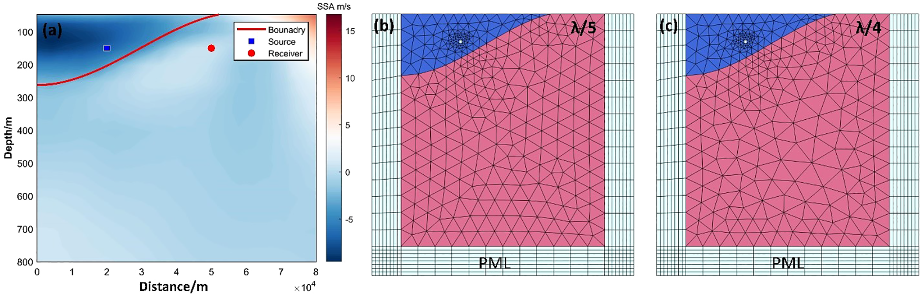 By combining correlation analysis and hierarchical clustering, the three-dimensional distribution of the SSA core area boundary is obtained, as illustrated in Figure 7a. By integrating the boundaries at different depths using B-spline surface fitting, the three-dimensional structure of the negative SSAE can be reconstructed. A critical step in this process is determining the optimal frequency combination in both the longitudinal and latitudinal directions to minimize the fitting error between control points. To achieve this, cross-validation is performed, and the results are presented in Figures 7b, c.