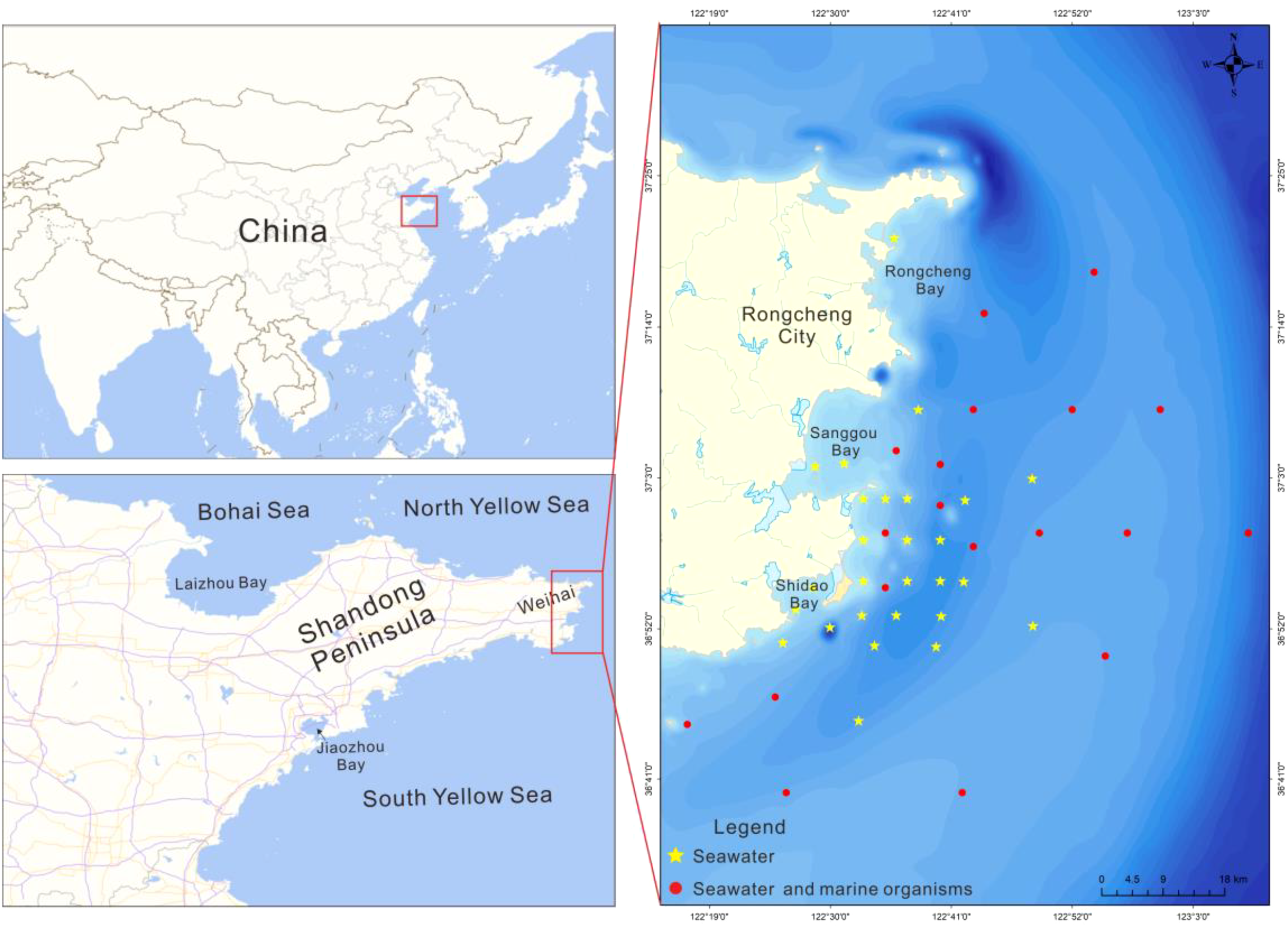 46 surface seawater samples and 19 marine organisms were collected from Rongcheng coastal area in July 2017 (Figure 1). The sample collection, preservation, and transportation methods followed the ‘Specifications for Marine Surveys’ (GB/T12763-2007).