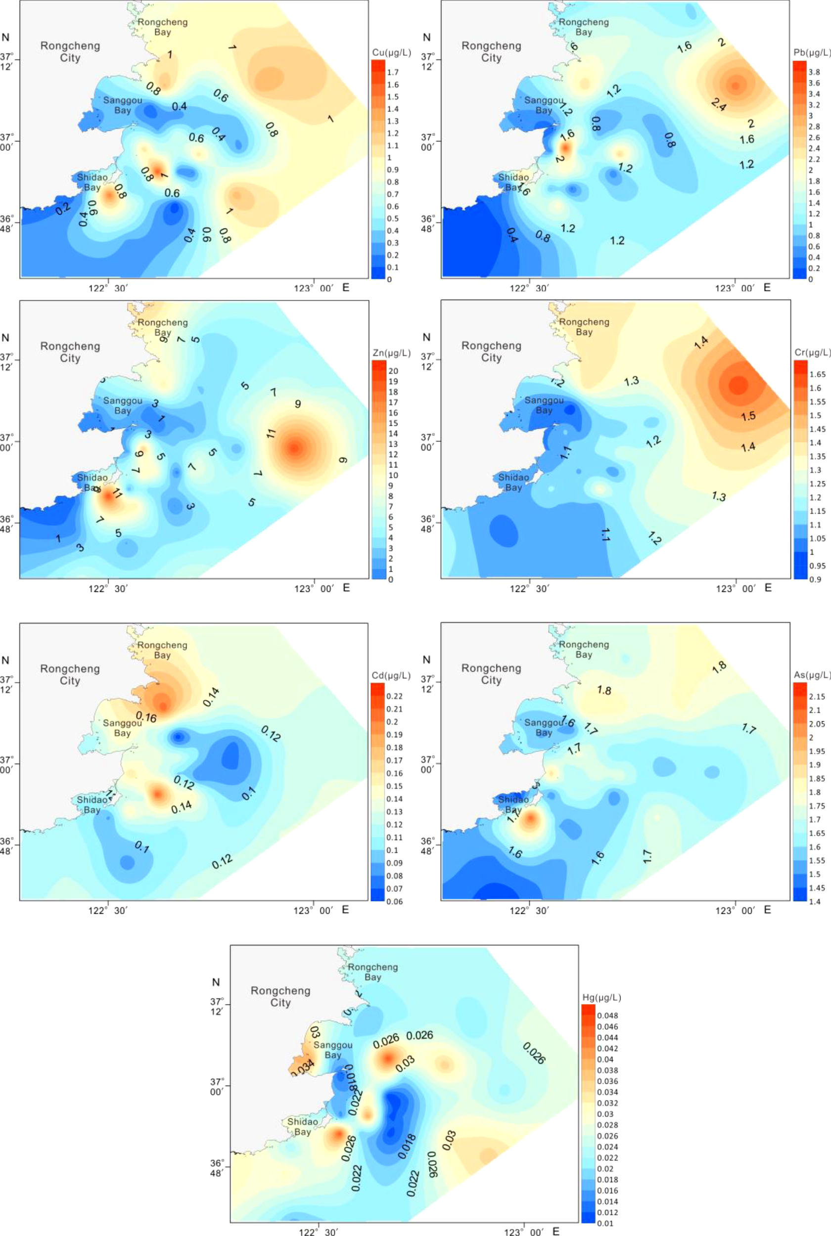 Figure 2 shows the spatial distribution of heavy metal(loid)s in the surface seawaters in the study area. The distribution of Cu, Pb, Zn, and Cr were similar, with the high concentrations mainly appeared in the Rongcheng offshore area. The high concentrations of Cu, Zn, Cd, As, and Hg were also observed outside of the Shidao Bay.