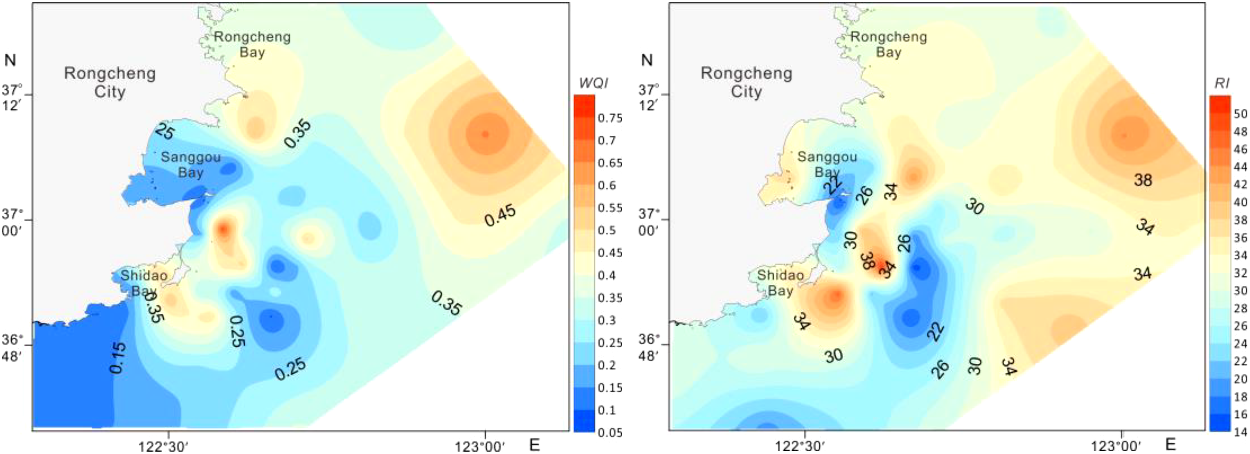 Spatial distributions of WQI and RI values in the seawater.