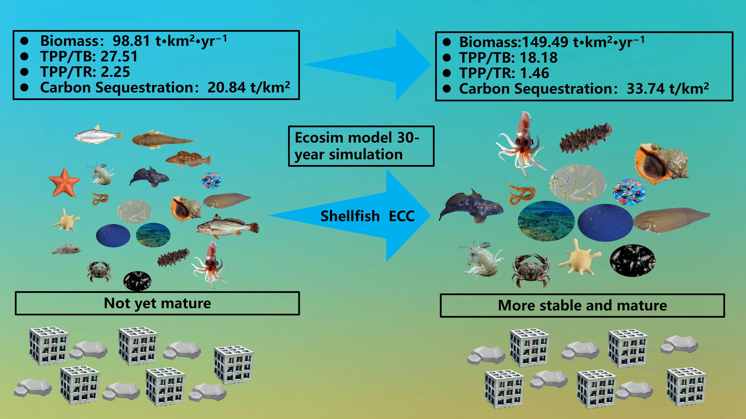 In general, the results show that in the process of marine ranching management, reasonable control of the number of shellfish can improve the stability of the system and increase its carbon sequestration capacity. The research results can provide a scientific reference for the ecological service function of marine ranching in the future and increase the carbon sequestration service function of marine ranching ecosystems.