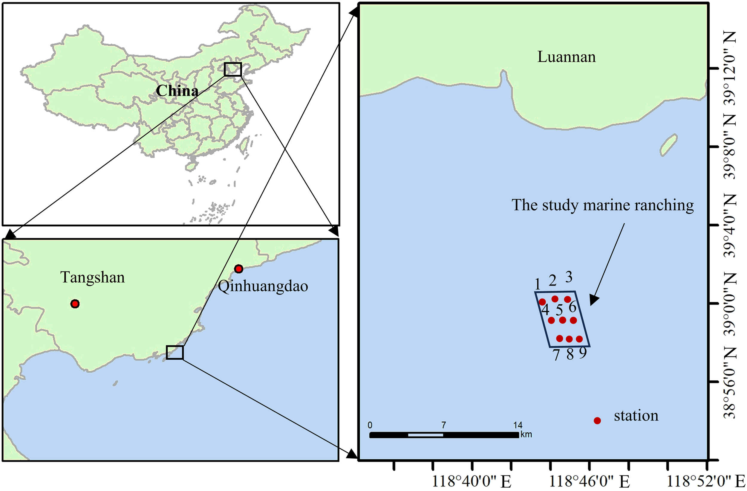 Haizhidu marine ranching is located near the Tangshan Bay International Tourism Island, in the center of the Bohai Bay (Figure 1). The sea area belongs to the northern temperate monsoon climate, with an average annual temperature of roughly 10°C and an average precipitation of 613.2 mm/a. According to historical meteorological data, there are rare records of disastrous weather and severe sea conditions in the sea area, and it is one of the fourth batch of national marine ranching demonstration places in China.