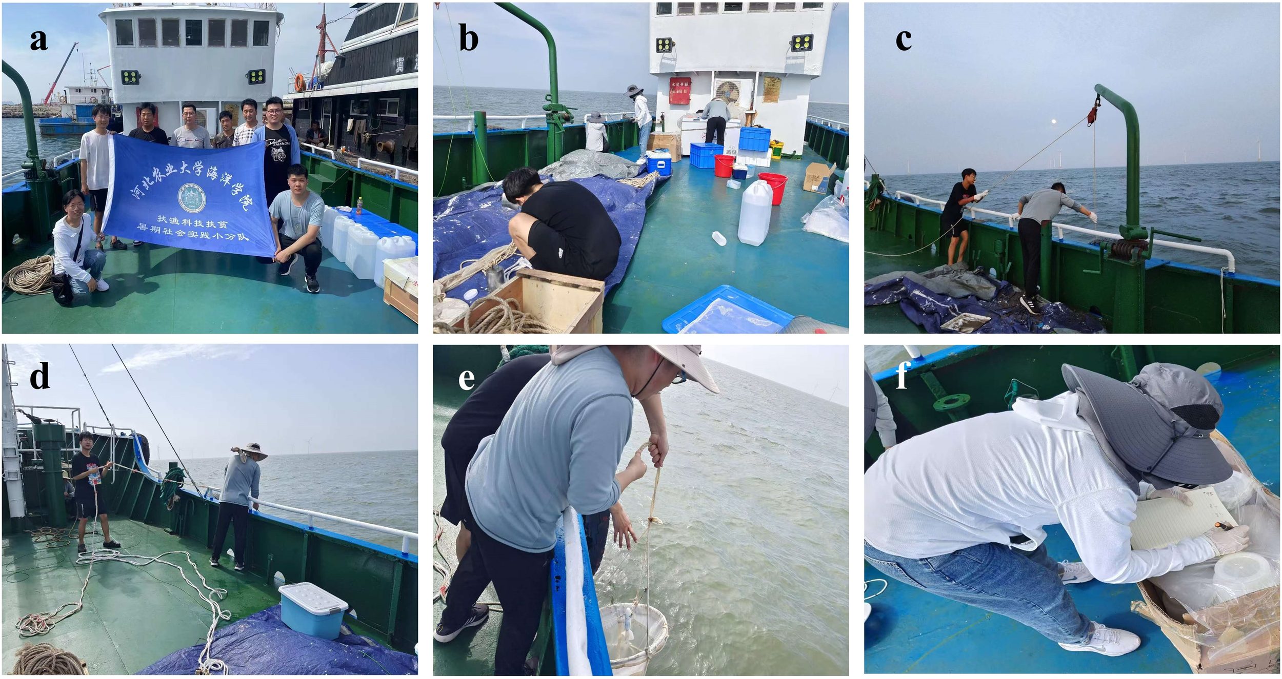 On-site sampling (a: group photo of the crew; b: preparation before sampling; c: collecting sediments; d: collecting phytoplankton; e: collecting zooplankton; f: recording data).
