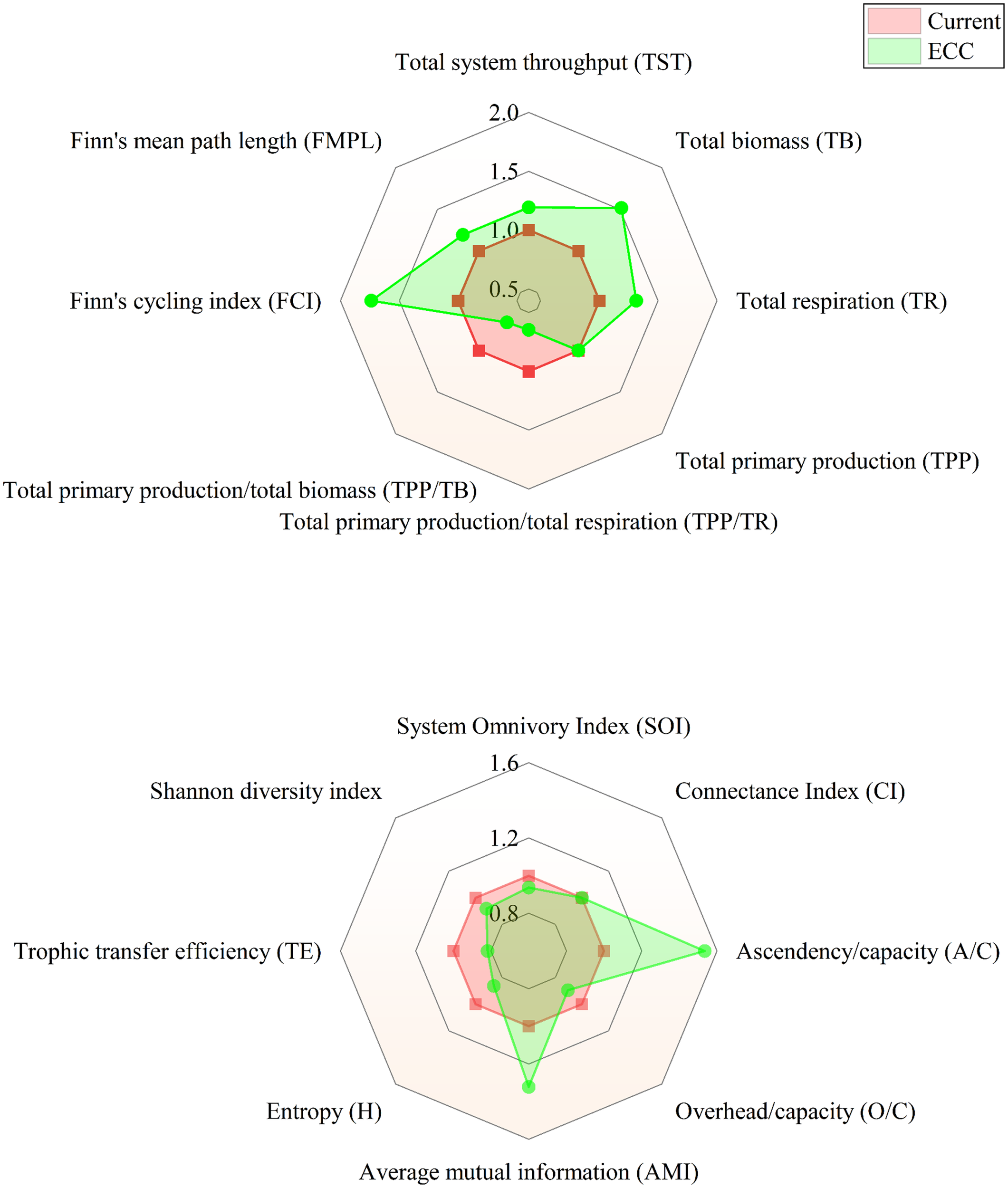 This study also calculated the trophic transfer efficiency (TTE), which is the ratio of the output to the throughput of adjacent trophic levels. For systems including more than two trophic levels, the average TTE value was employed. The shannon diversity index (SDI) was employed as an index to measure biodiversity. The changes in the ecological network index were intuitively displayed through radar plots to depict the dynamic changes of the environment. In addition, the Lindemann energy flow diagram was utilized to demonstrate the changes in energy transfer before and after the shellfish value-added, so as to better study the energy transfer efficiency within the ecosystem.