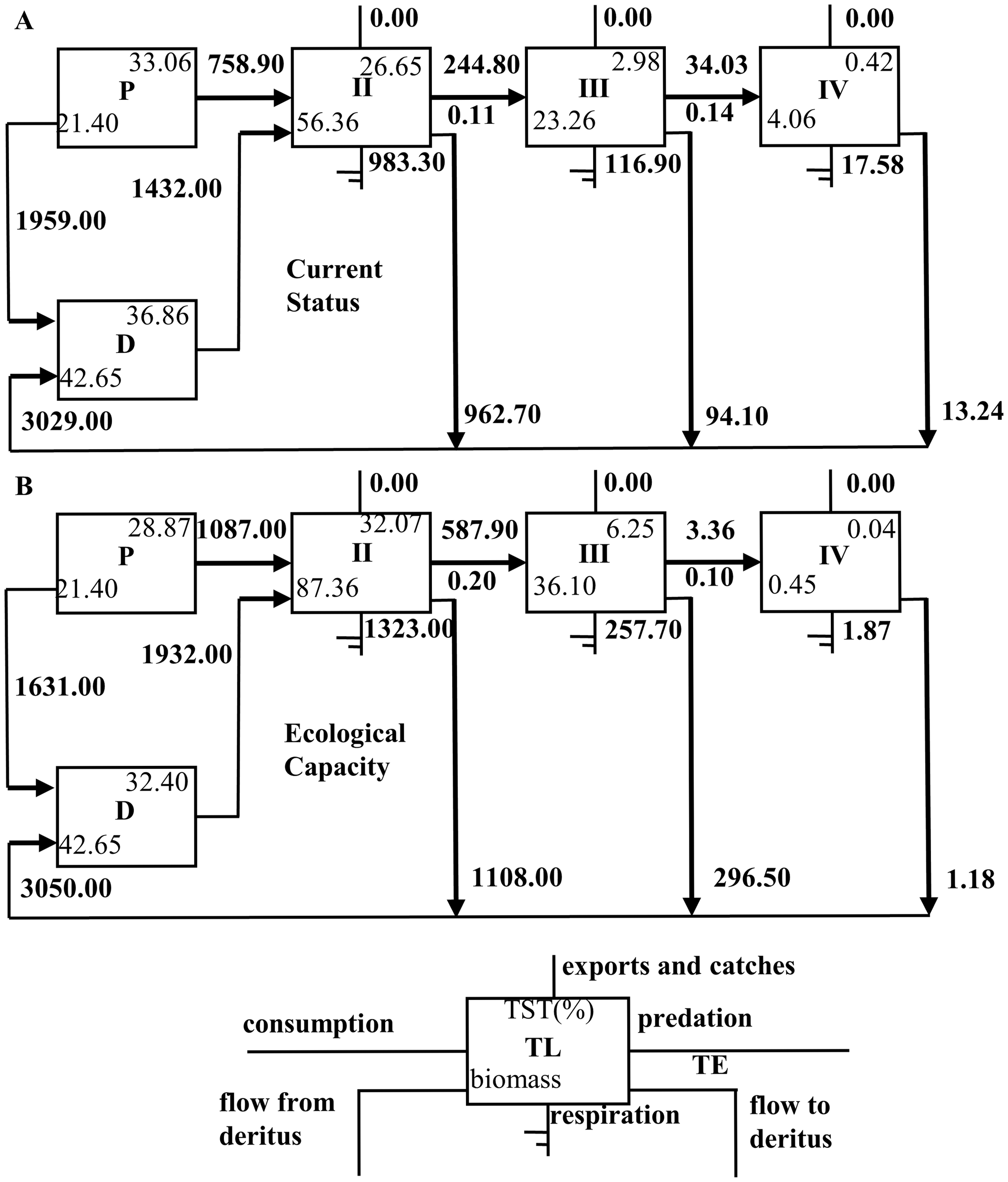 In this study, we used a collection of ecological indicators to completely describe the structure and function of the ecosystem using the ecological network analysis (ENA) module of the EwE software (Loneragan et al., 2013). For details, please refer to the work of Sreekanth et al. (2021). We quantified the overall characteristics of the ecosystem by evaluating key indicators such as total system throughput (TST), total primary productivity (TPP), total biomass (TB) and total respiration (TR), which are important for assessing the overall activity and size of the ecosystem (Xu et al., 2019; Ortiz et al., 2015). In addition, the TPP/TR and TPP/TB ratios were determined to measure the stability and maturity of the ecosystem (Odum, 1969).