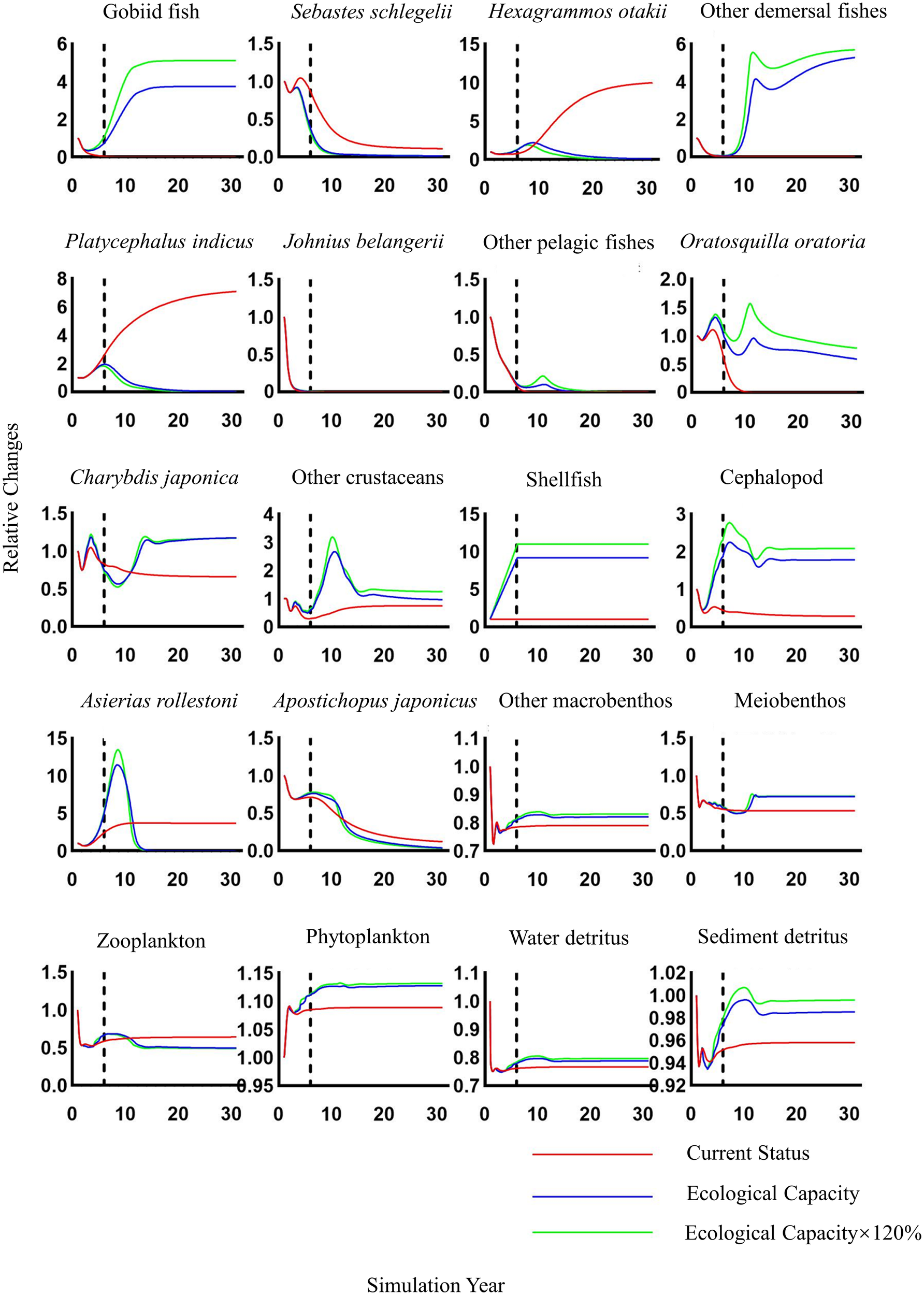 In this study, to reflect the balance and stability of the ecosystem in the Ecopath model, we assessed the ECC of all functional groups excluding phytoplankton, water detritus, and sediment detritus. The specific strategy is to gradually increase the biomass of a functional group until the EE of any functional group reaches 1, at which time the functional group is judged to have attained the ECC.