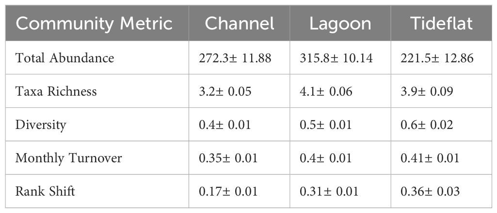 Through qualitative analysis of temporal patterns shown in Figure 3, we observed that community metrics varied across the sampling season (April to September) and between years, and this variability differed across the habitat types (Figure 3). Total abundance increased over the sampling season for channel and lagoon habitats; however, abundance peaked mid-season in tideflats and often declined toward the end of the season (Figure 3a). Lagoons appeared to have the largest change in total abundance across the season in addition to the highest average abundance overall (Table 1). Patterns of seasonal change in abundance appeared to be consistent across years for channel and lagoon habitats, but tideflats appeared to experience an increase in seasonal changes in abundance from 2017 to 2023. Species richness was variable within seasons across all habitat types with no discernible pattern, and this variability was consistent over time (Figure 3b). Tideflats appeared to have the largest variability in species richness within the sampling season and across years. Shannon diversity index usually declined over the course of the sampling season in channel and lagoon habitats, and it was much more variable with no obvious seasonal trend in tideflat habitats.