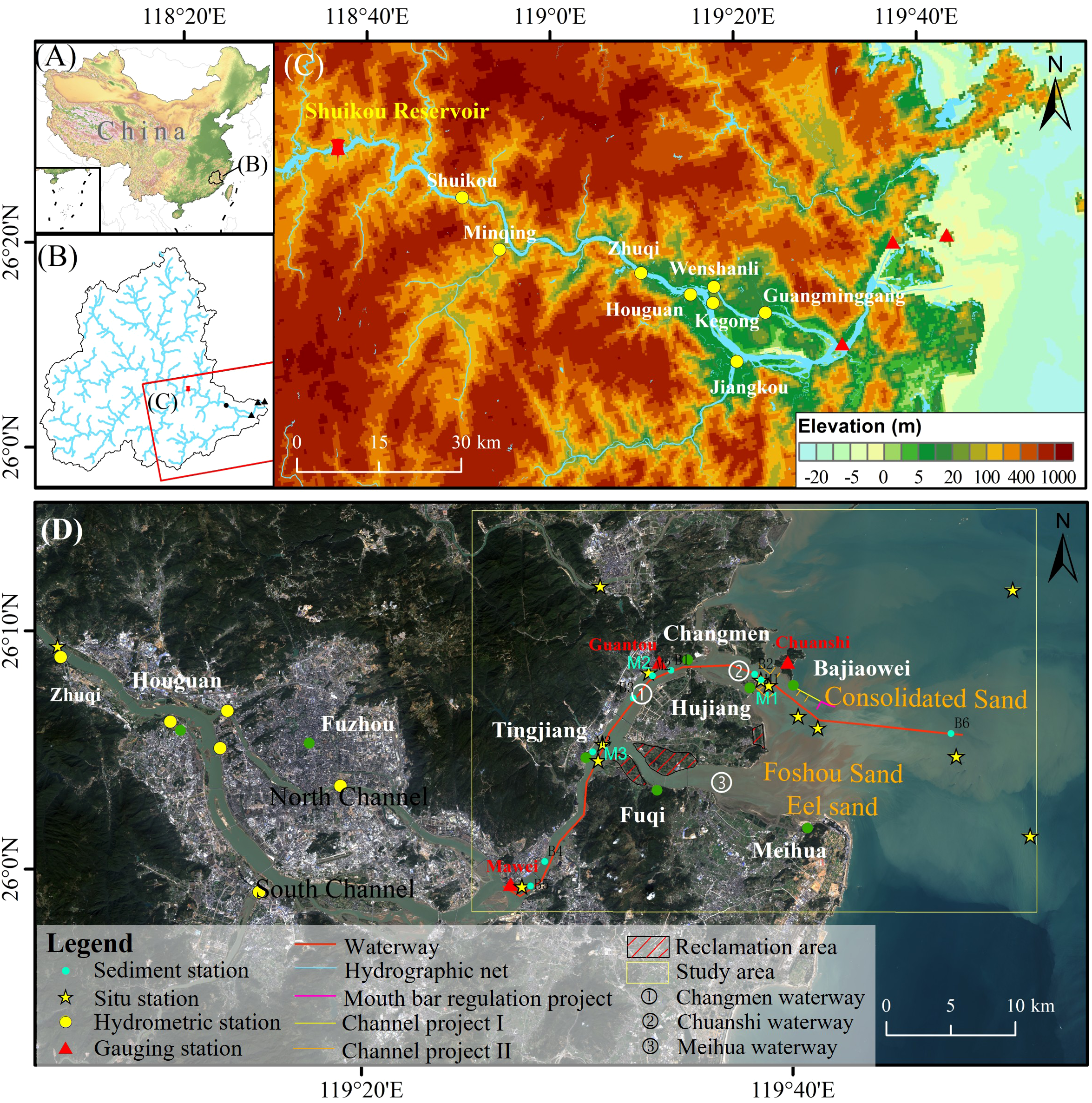 Location of the study area. (A) Location of the Minjiang River Basin, (B) River system of the Minjiang River Basin, (C) Topography of the Minjiang River, (D) Location of the ME.