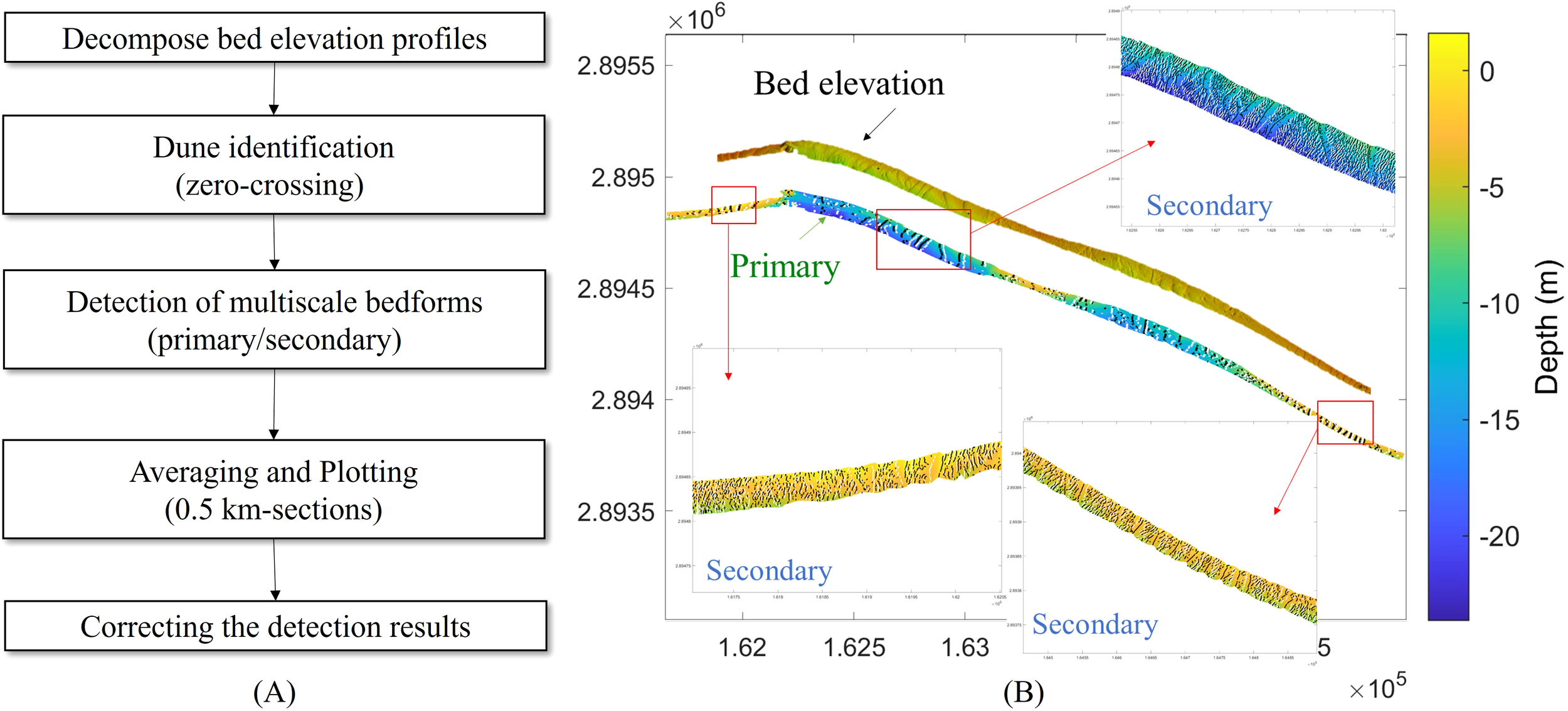 Multiscale bedform detection process (A) and detected examples of primary and secondary bedforms (B).