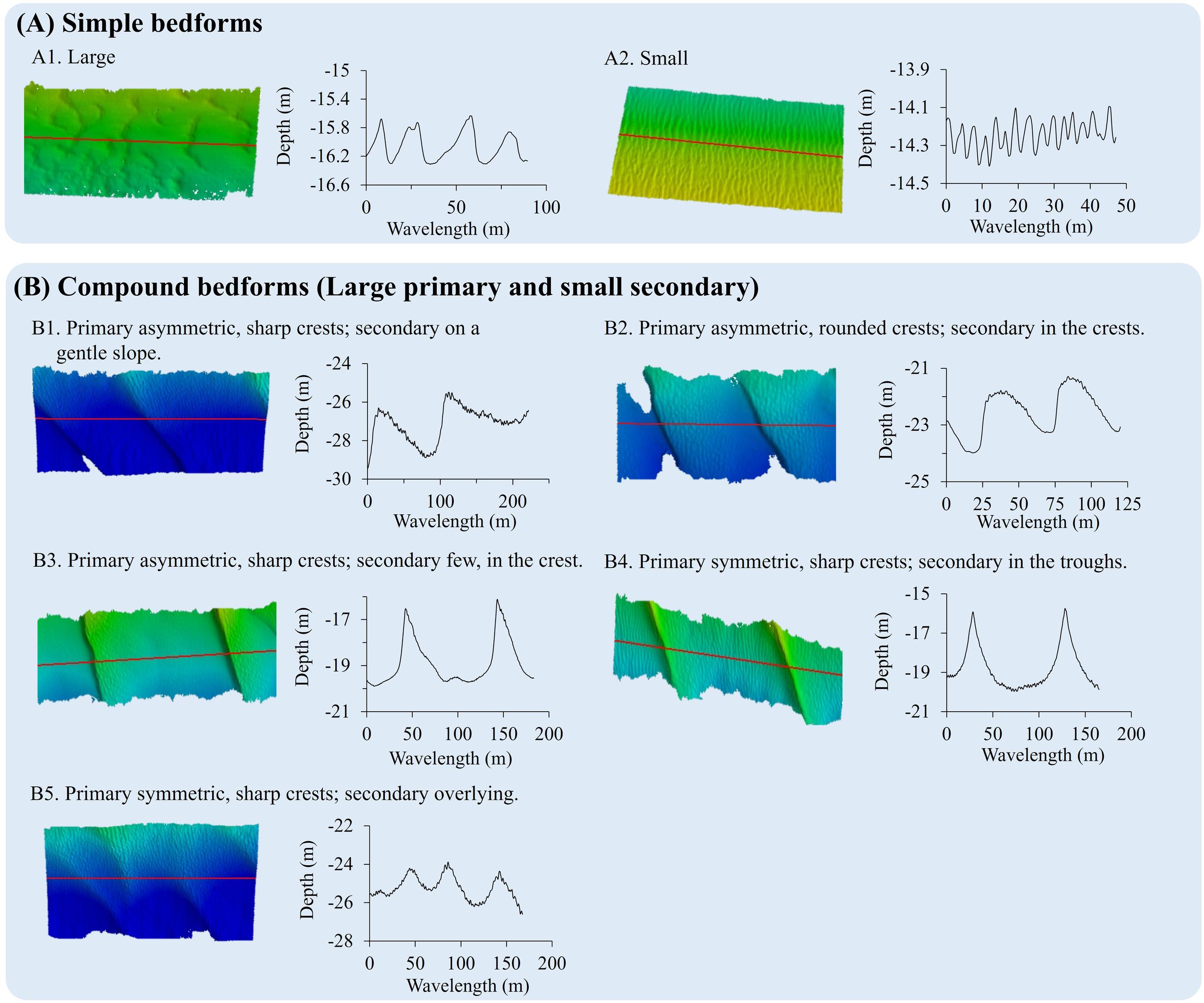 Different types of multiscale bedforms observed in the ME. Diagram showing simple and compound bedforms with topographic images and corresponding graphs. (A) Simple bedforms: A1. Large with undulating elevation profile. A2. Small with finer texture. (B) Compound bedforms (Large primary, small secondary): B1. Asymmetric sharp primary crests with secondary on slopes. B2. Asymmetric rounded primary crests with secondary at crests. B3. Asmmetric, sharp primary crests with few secondary. B4. Symmetric sharp primary crests with secondary in troughs. B5. Symmetric, sharp primary crests with secondary overlaying.