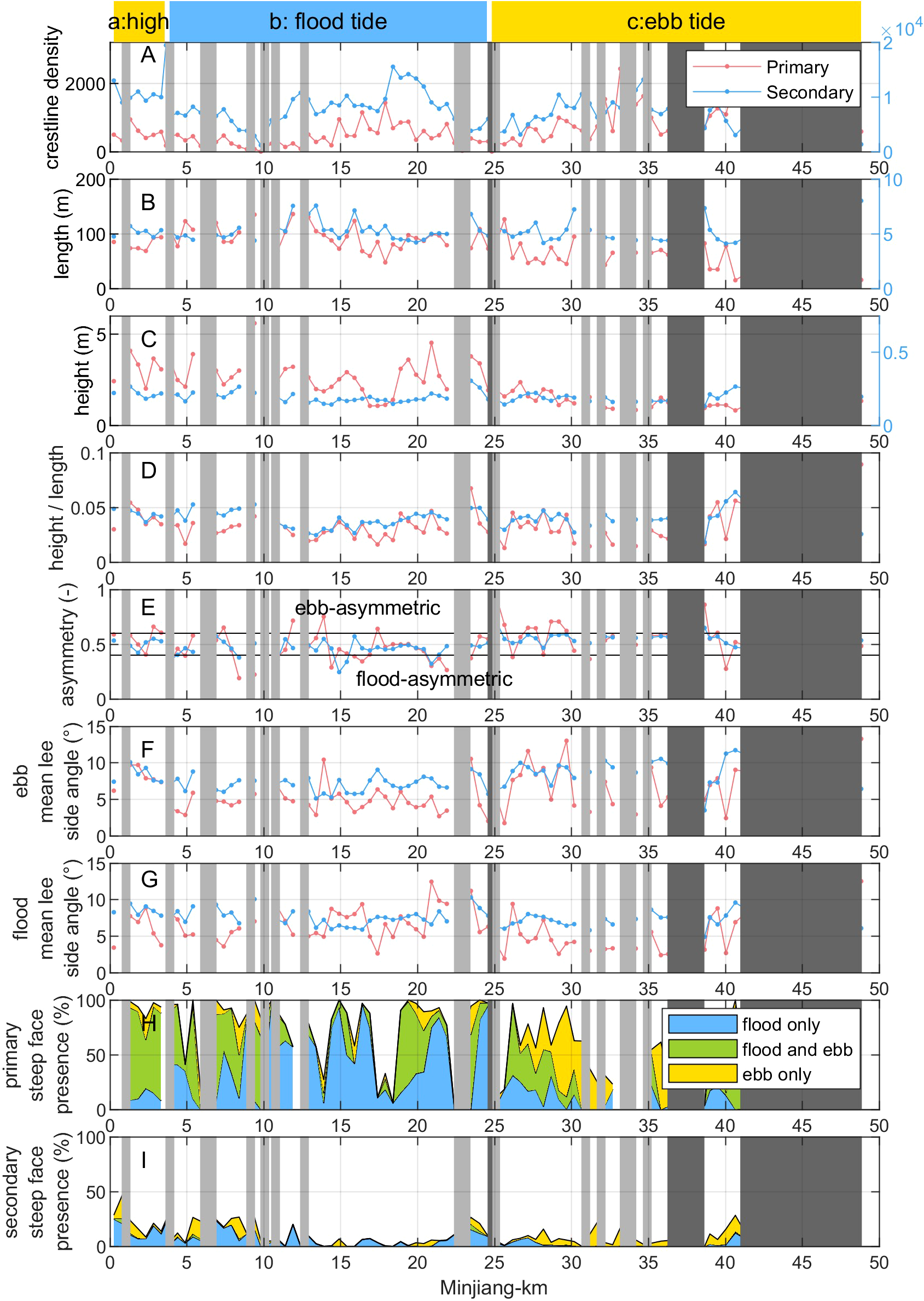 Multiscale bedform characteristics along the Minjiang Estuary, primary (red) and secondary (blue). (A) crestline density (number of crestlines per square kilometer); (B) bedform length; (C) bedform height; (D) height/length; (E) asymmetry; (F) ebb lee side mean angle; (G) flood lee side mean angle; (H) percentage of primary bedforms (compared to the total number of bedforms measured) which possess a flood steep face, an ebb steep face, or both a flood and ebb steep face; (I) percentage of secondary bedforms (compared to the total number of bedforms measured) which possess a flood steep face, an ebb steep face, or both a flood and ebb steep face. The light grey and dark grey areas on all plots represent areas with only few bedform (BEP bedform density < 300 bedforms/km2) and without data, respectively.