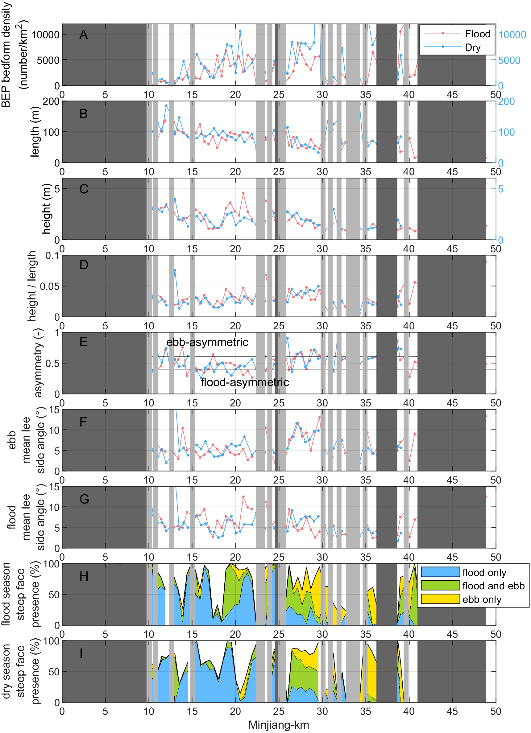 Primary bedform characteristics along the ME in the flood (red) and dry (blue) season. (A) BEP bedform density (number of bedforms per square kilometer); (B) bedform length; (C) bedform height; (D) height/length; (E) asymmetry; (F) ebb lee side mean angle; (G) flood lee side mean angle; (H) percentage of bedforms in flood season (compared to the total number of bedforms measured) which possess a flood steep face, an ebb steep face, or both a flood and ebb steep face; (I) percentage of bedforms in dry season (compared to the total number of bedforms measured) which possess a flood steep face, an ebb steep face, or both a flood and ebb steep face. The light grey and dark grey areas on all plots represent areas with only few bedform (BEP bedform density < 300 bedforms/km2) and without data, respectively.