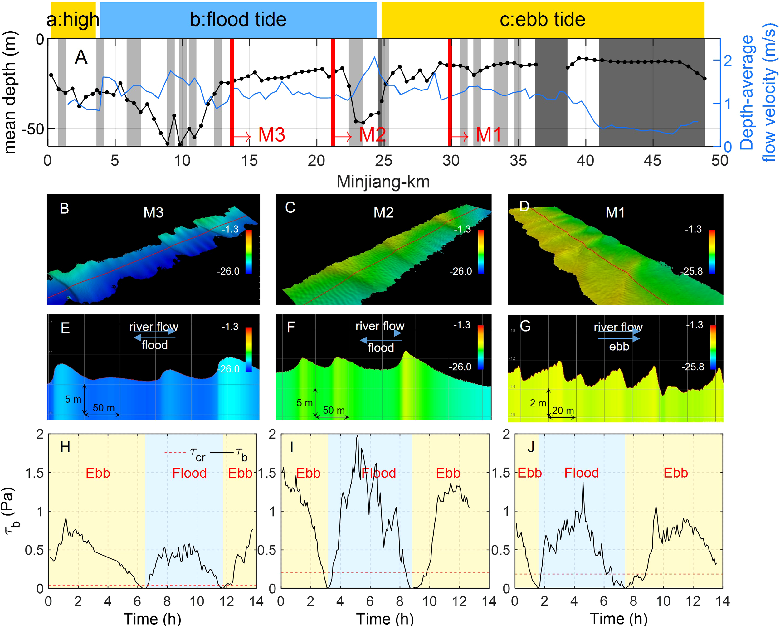 Depth-averaged flow velocity, mean water depth, bedform morphology during the survey, time series distribution of bed shear stress τb and critical bed shear stress τcr during a spring tide cycle in Station M3, M2 & M1 of the ME on 2023-08. M1, M2, and M3 are hydrological observation stations within the tidal cycle. Panel (A) represents the depth-averaged flow velocity and mean water depth along the ME, Panels (B–D) represent the 3D morphology of bedforms near the station, and Panels (E–J) represent the bedform profiles. The yellow-shaded areas in panels (H–J) represent the ebb tide period, while the blue-shaded areas represent the flood tide period.