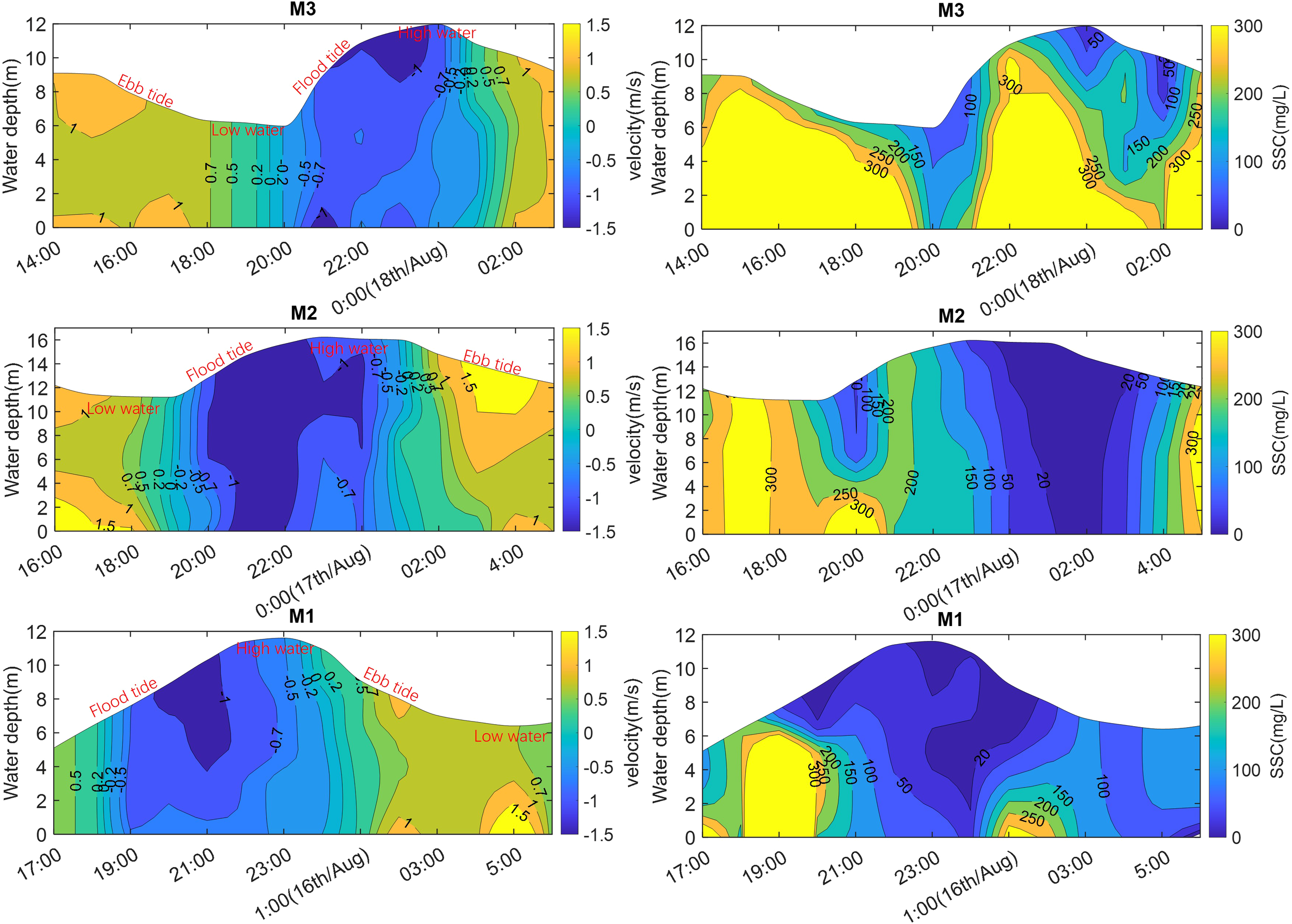 Time series distribution of flow velocity and suspended sediment concentration during a spring tide cycle in the flood season of 2023 at Station M1~M3 in the Minjiang Estuary. Positive velocity values represent ebb-directed flow, and negative values represent flood-directed flow.