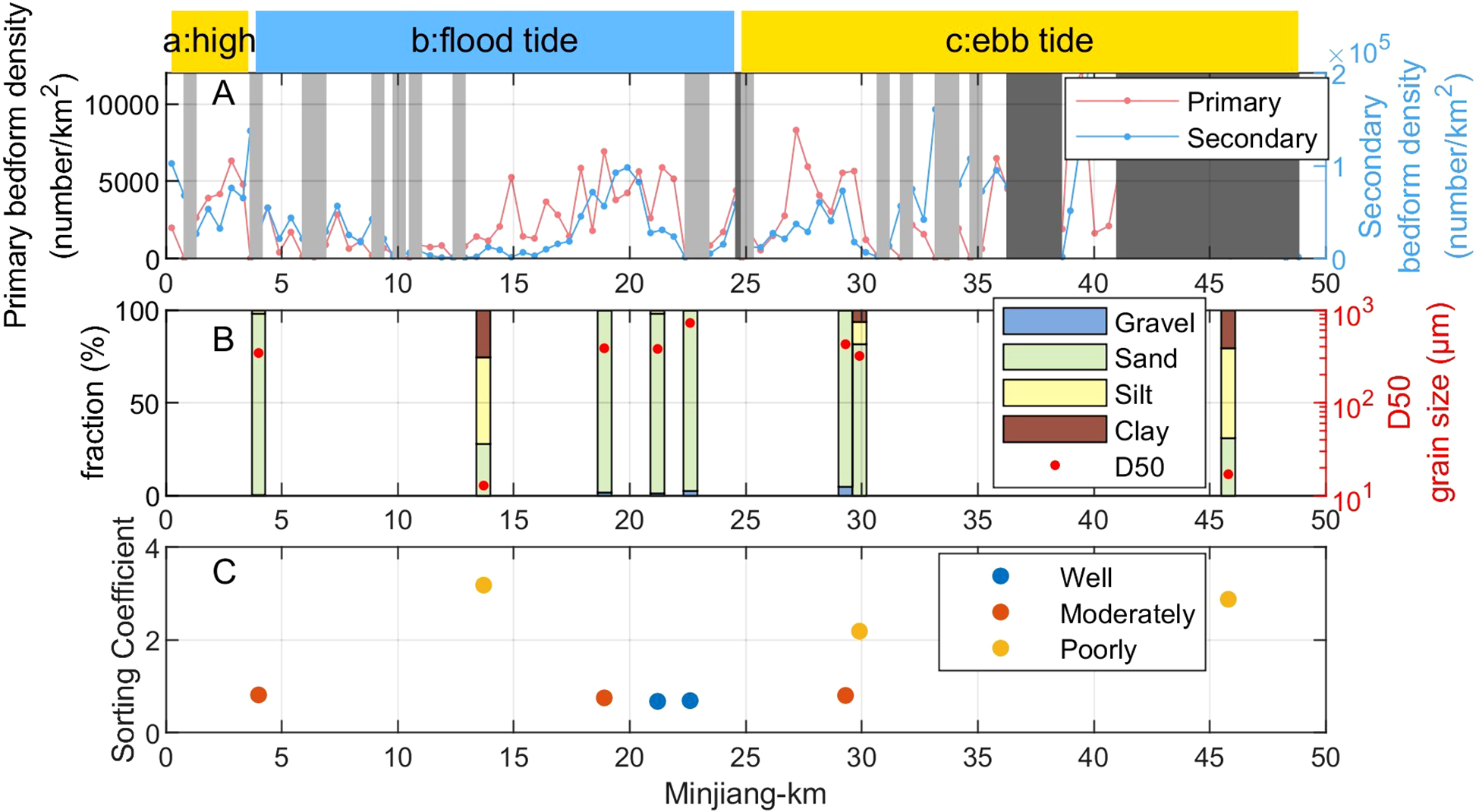 Relationship between bed-surface sediment grain size, fractions, sorting coefficients and bedform distribution. (A) Primary and secondary bedform density, (B) D50 grain size and fractions of bed-surface sediment, and (C) Sorting coefficients along the ME.