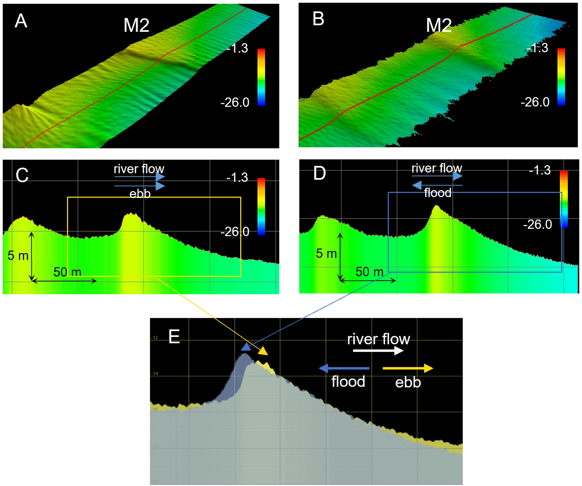 Bedform morphology at Station M2 during flood (2023-08-17, 08:53 UTC+8:00) and ebb tides (2023-08-16, 14:06 UTC+8:00). Panels (A, B) show the 3D morphology of the same bedforms in different tidal phases, while panels (C–E) display the bedform profiles.
