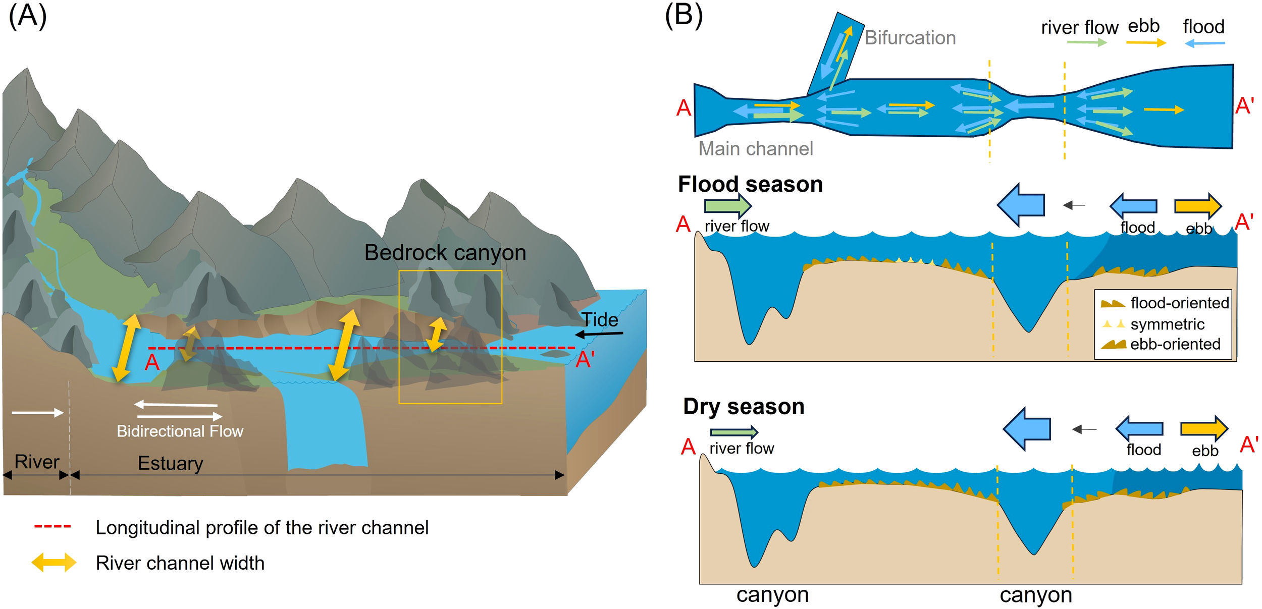 Schematic diagram of the response pattern of bedform development in tectonic macrotidal estuaries to bedrock canyon structure and seasonal hydrodynamic differences. (A) 3D topography of a mountainous macrotidal estuary, (B) Channel plan and micro-topographic longitudinal section of a tectonic mountainous macrotidal estuary.