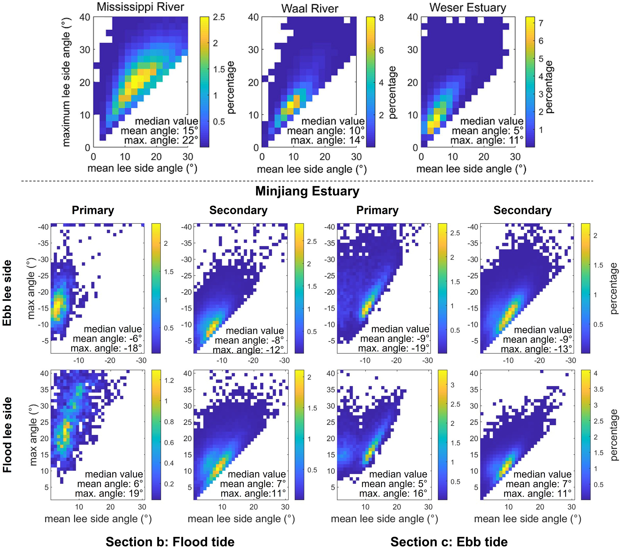 Comparative analyses of mean lee side angles and maximum lee side angles of dunes in different river and estuarine environments reflect the different hydrodynamic conditions and depositional processes in these systems. Existing studies have concluded that in river systems, dunes with a slope angle of 27° are found in streams <2.5 m, while dunes in deeper streams exhibit lower lee side angles (Bradley and Venditti, 2017). In large rivers, the mean lee side angles generally range from 5° to 20° (Figure 13 (Cisneros et al., 2020)). For example, dunes in the Mississippi River have relatively steep lee sides, with average angles of 15° and maximum angles reaching 22°. In contrast, dunes in the Waal River exhibit milder slopes, with an average lee side angle of 10° and a maximum angle of 14°. Based on the conclusions from numerical simulation experiments by Lefebvre and Cisneros (2023) on the influence of dune lee sides on turbulence, dunes in the Mississippi and Waal Rivers can be classified as intermediate-angle dunes. Intermittent flow separation may occur above the lee side. In tidal environments, bedforms are typically low-angle, with lee side angles ranging from 2° to 20° (Cheng et al., 2004b; Damen et al., 2018; Franzetti et al., 2013; Hu et al., 2018; Lefebvre et al., 2021; Lefebvre and Cisneros, 2023). For instance, bedforms in the Weser Estuary are characterized by gentle slopes, with a mean lee side angle of only 5° and a maximum slope of 11°. These low-angle dunes generally lack flow separation and exhibit weak turbulent wakes, indicating limited hydrodynamic disturbance.