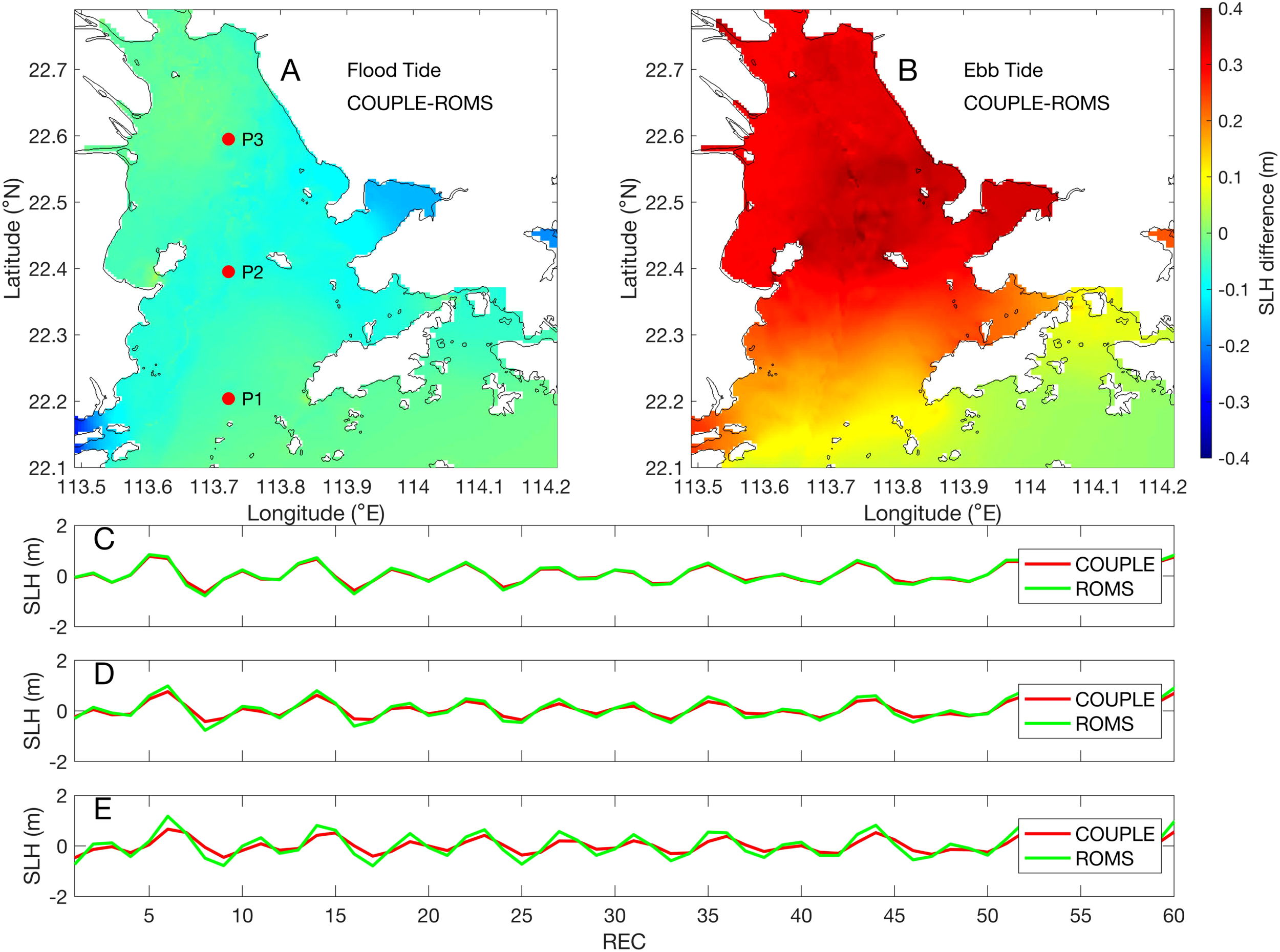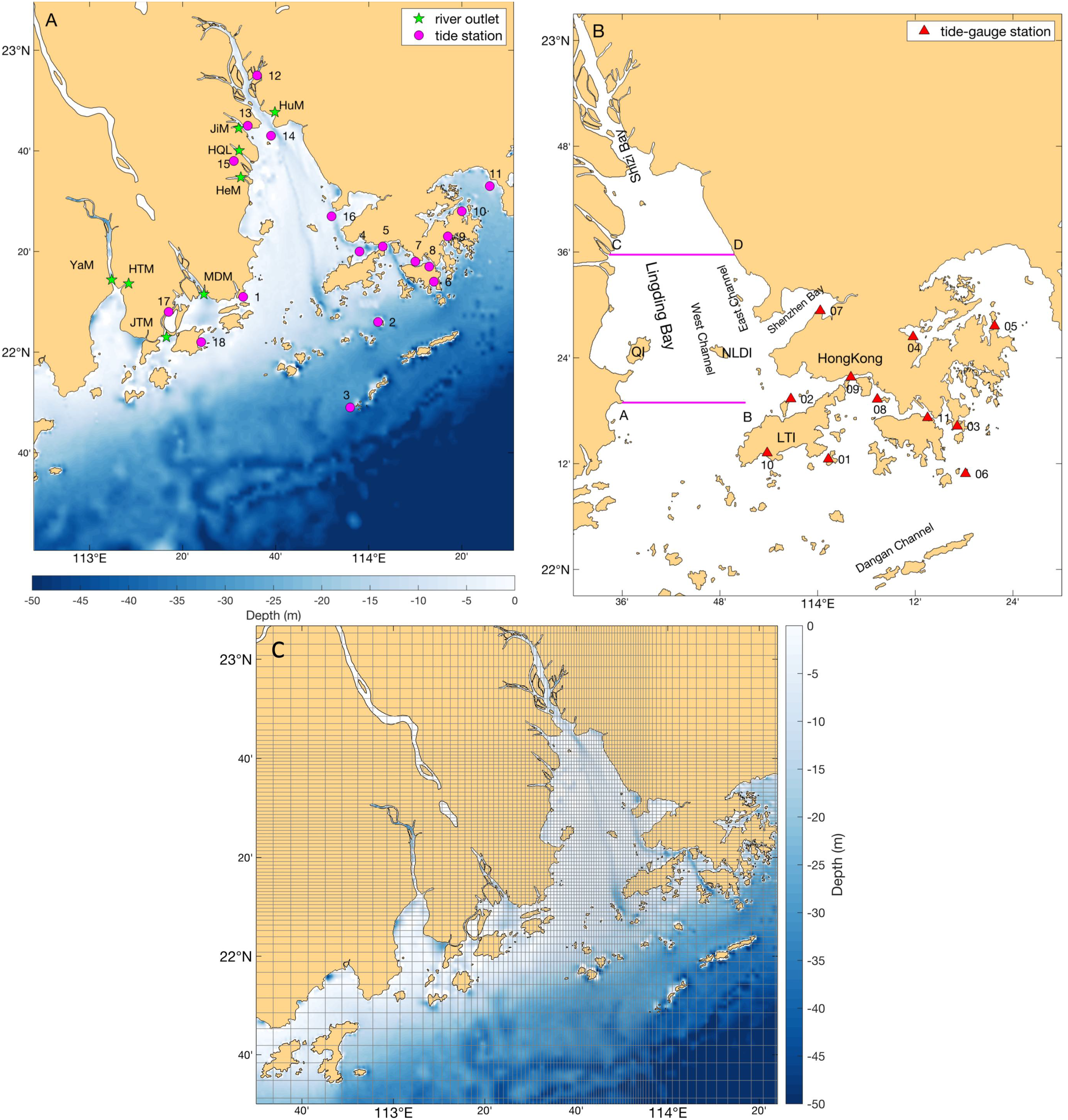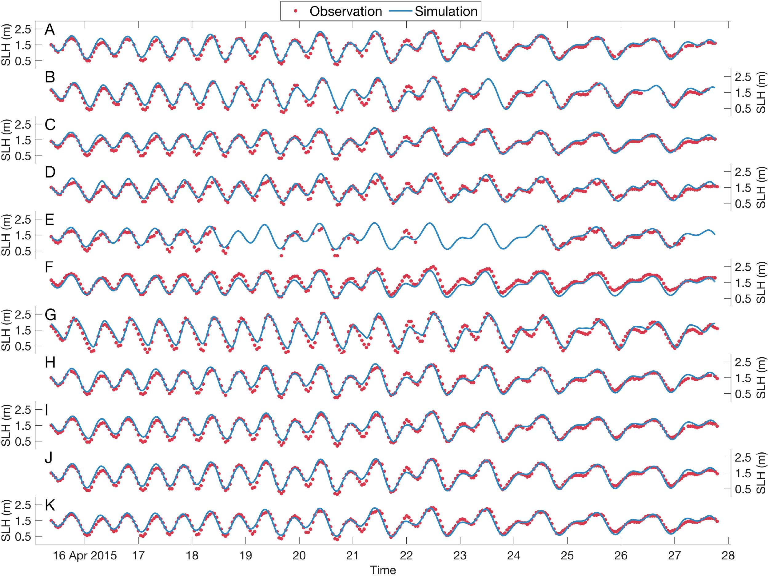 Furthermore, the model’s hindcast water levels were validated against tidal observations from 11 tidal gauge stations (Figure 1B) provided by the Hong Kong Observatory, covering the period from 9:00 15th April to 18:00 27th April 2015 (GMT+8). As visually demonstrated in Figure 3, simulated results closely match observations.