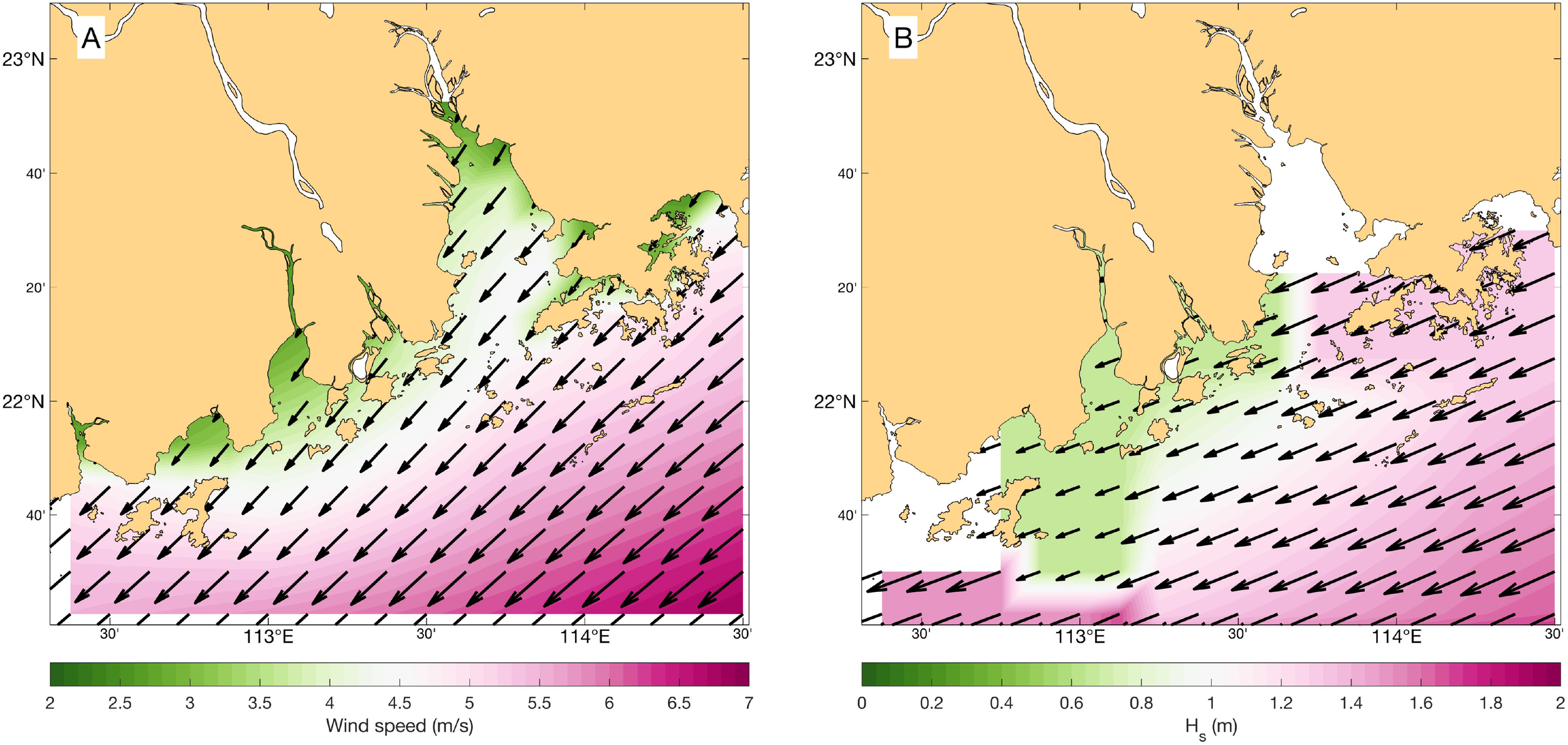Climatological monthly-averaged wintertime wind (A) and wave (B) fields in the Pearl River Estuary. Data is originated from the ERA-interim reanalysis, the arrows represent the wind or wave direction, with their length and background color corresponding to wind speed or significant wave height.