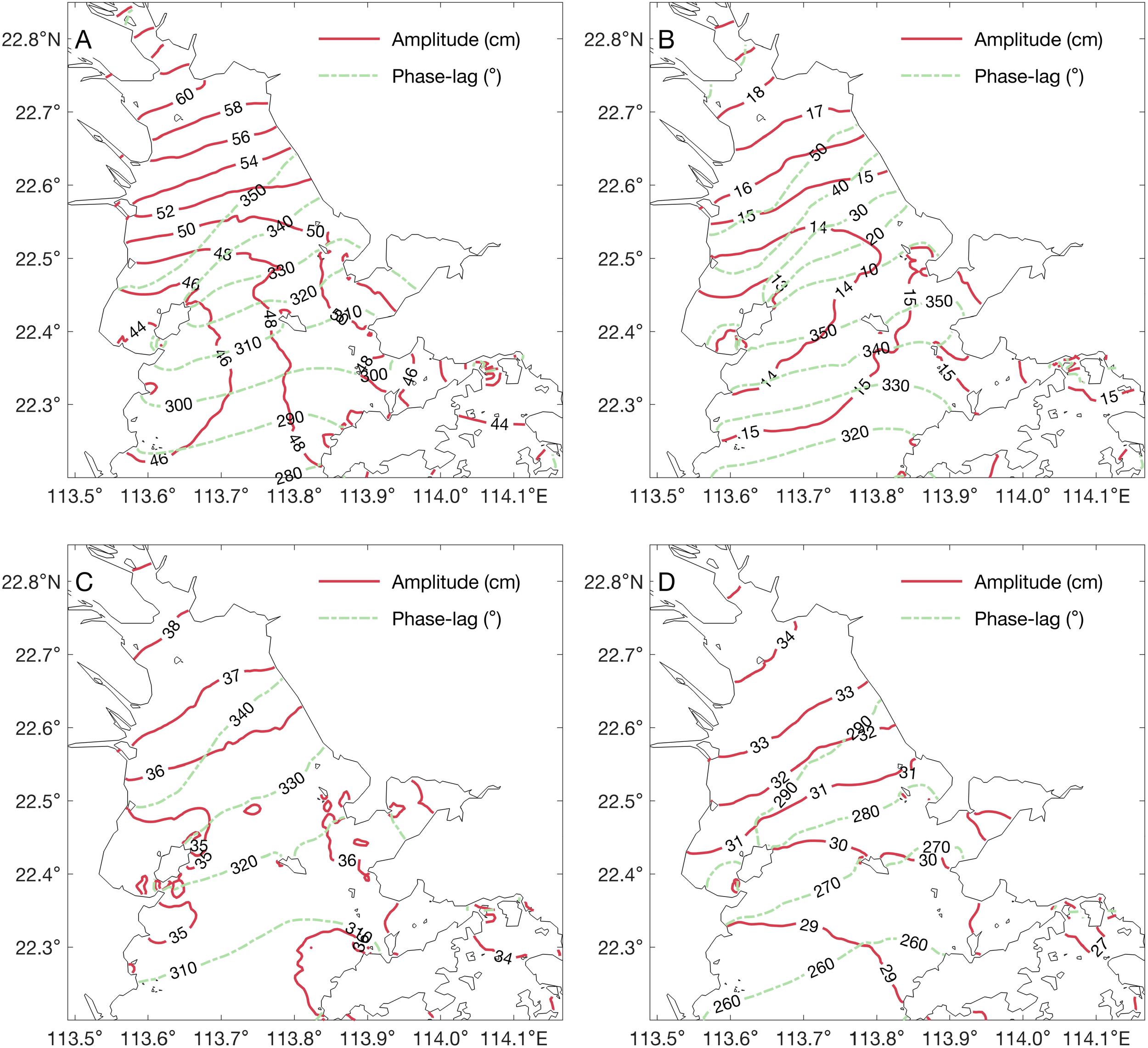 Cotidal charts of the M2(A), S2(B), K2(C), and O1(D) tidal constituents in the Pearl River Estuary.