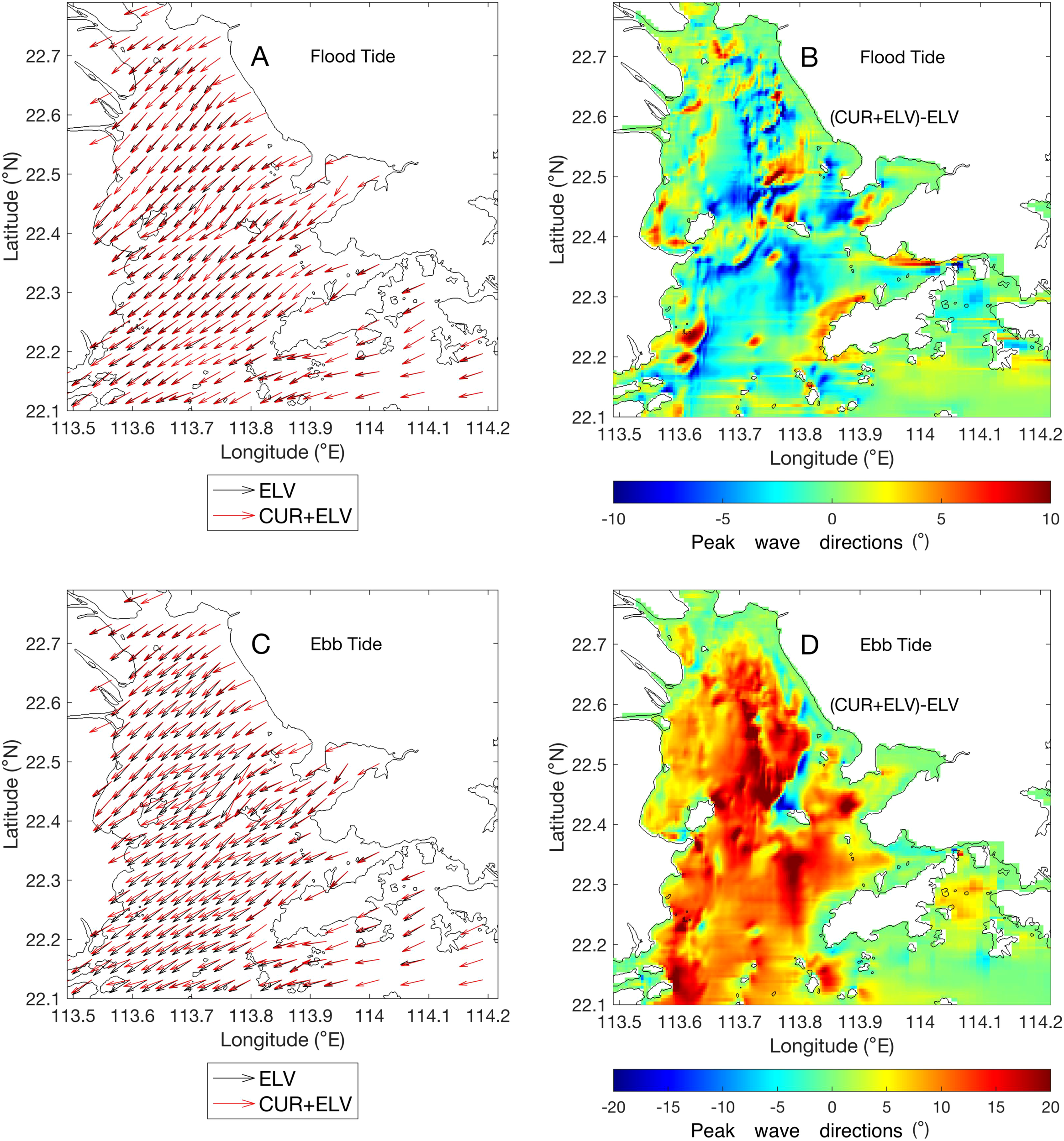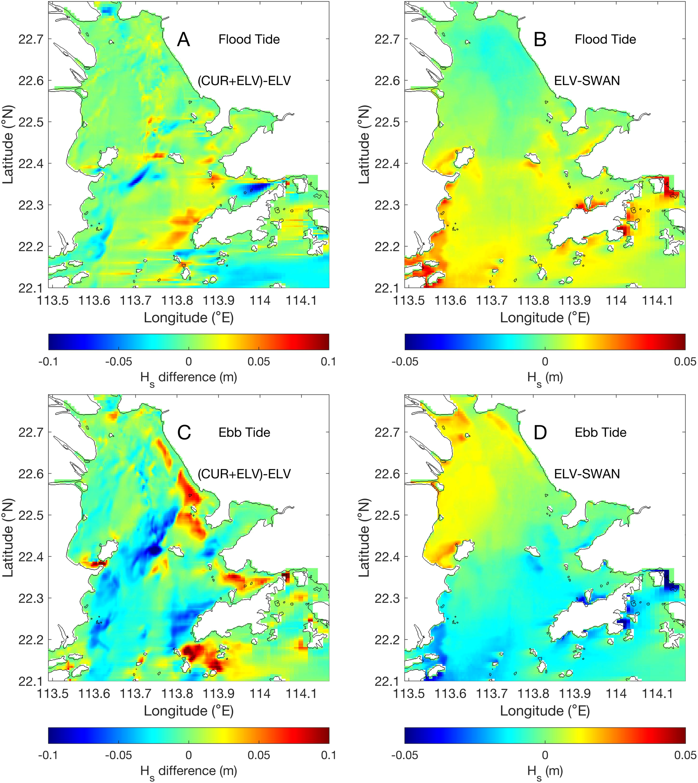 Adjustment of significant wave height by (A) the current field and (B) the water level at maximum flood; adjustment of significant wave height by (C) the current field and (D) the water level at maximum ebb. Note that the colorbar scale differs.