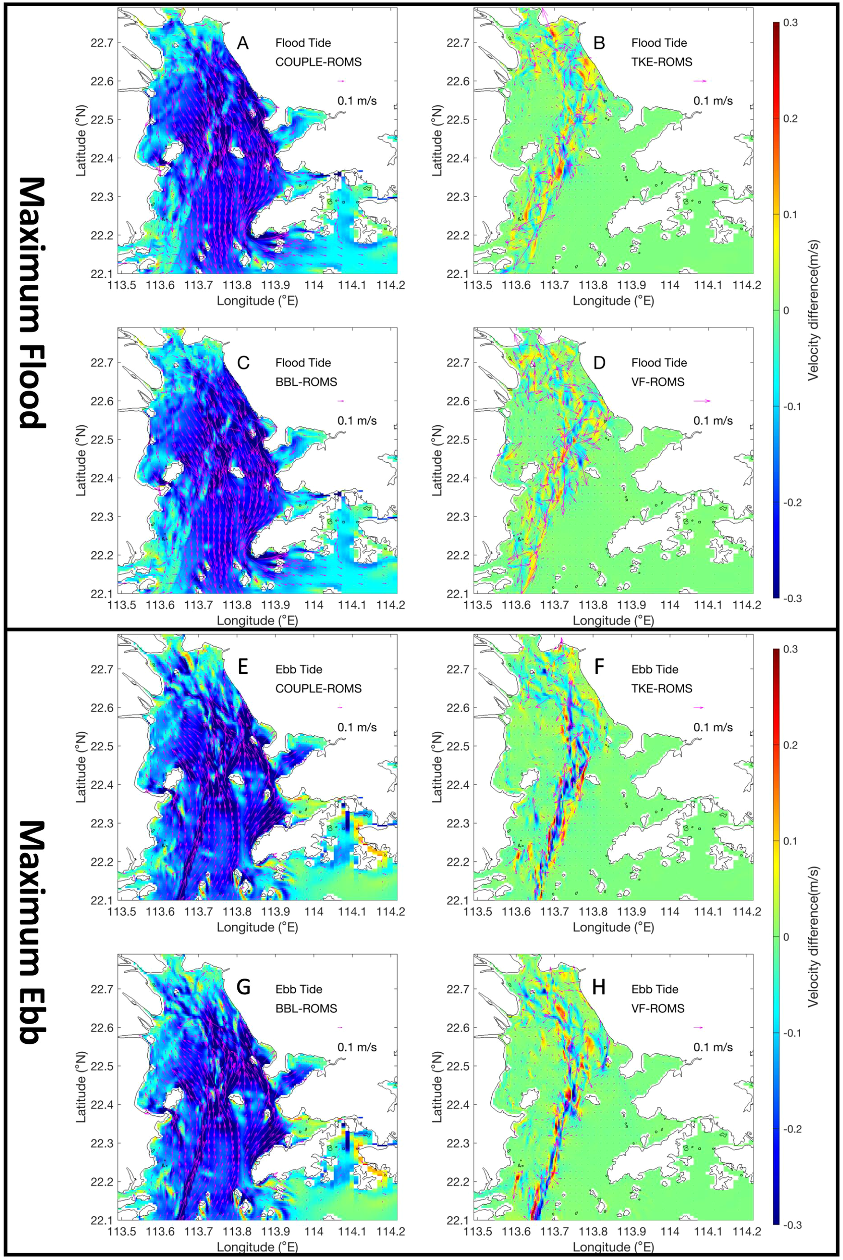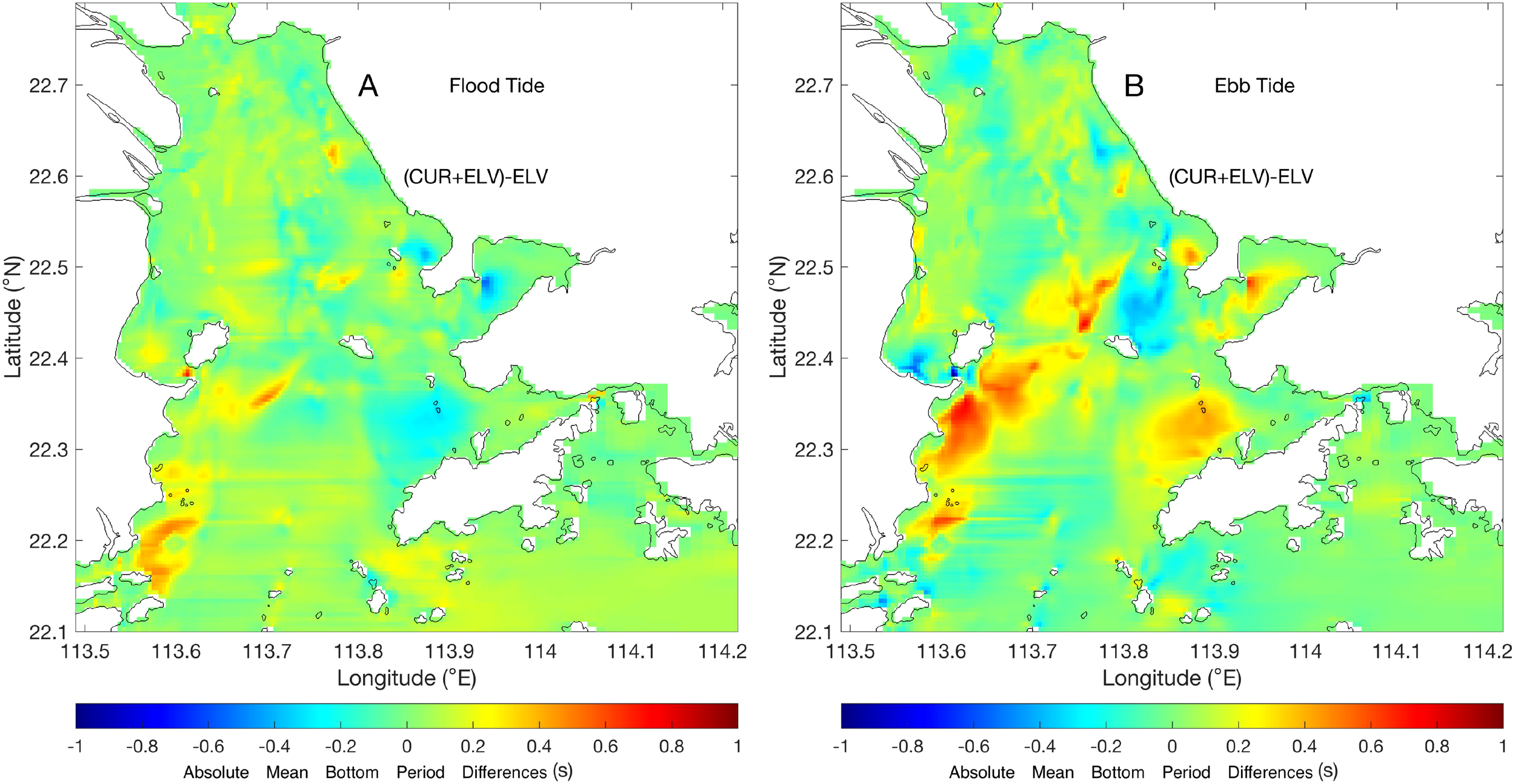 Using the results from the numerical experiments ELV (coupling only water levels) and CUR+ELV (coupling both currents and water levels), we analyzed the influence of the currents and water levels on significant wave height at maximum flood and ebb, as detailed in Figure 6. Figure 6A shows that at maximum flood, the significant wave heights increase across most estuarine areas, particularly west and north of Lantau Island. In this region, the tidal currents and waves are nearly opposite in direction, and the deep channel topography results in a higher local current velocity. The opposing currents enhance wave energy convergence more significantly here than in other areas of the estuary, leading to an adjustment in wave height of approximately 10%. This magnitude is consistent with the changes in typhoon-induced wave heights within the estuary caused by currents, as reported by Ren and Bao (2013). Figure 6B indicates that water levels also have a certain influence on wave height at maximum flood, especially in the coastal bays or islands south of 22.6°N, where the impact is approximately 4 cm. The variation in wave height is closely related to the spatial distribution of the water levels: at bay heads with negative water levels, the wave height slightly decreases due to the shallow water effect associated with negative water levels, which increases wave energy dissipation, thus reducing the wave height, and vice versa.