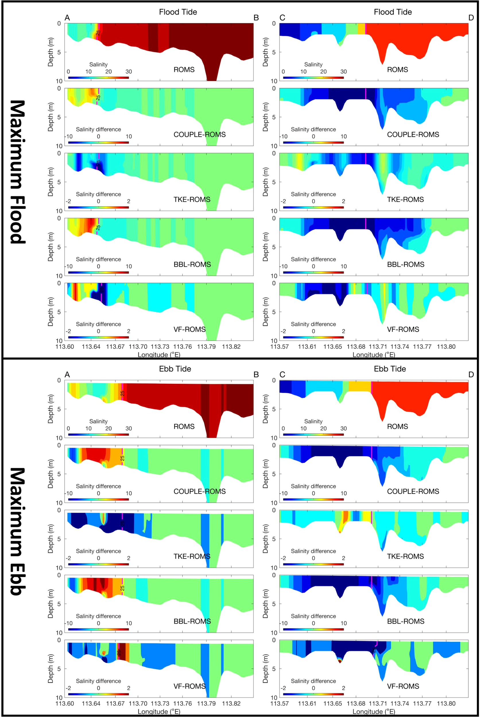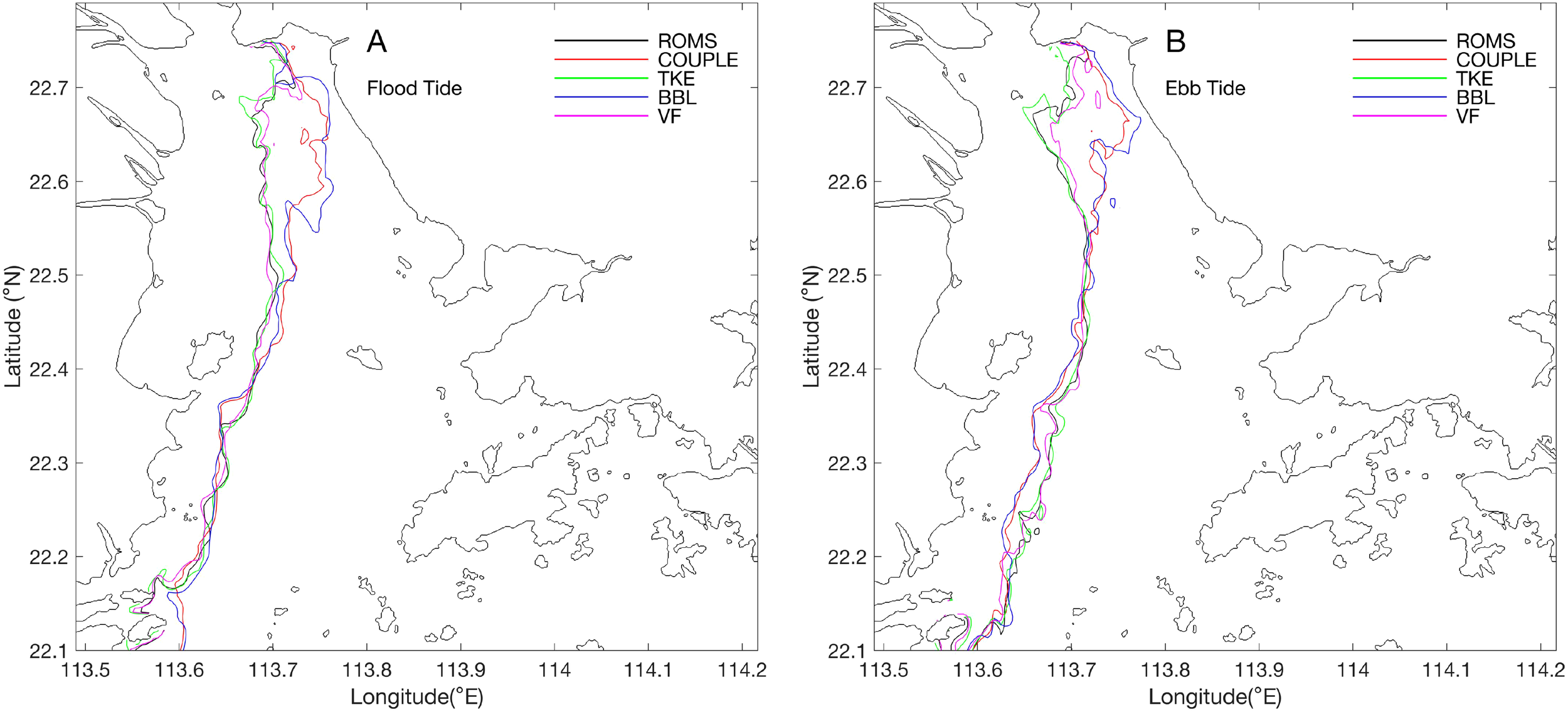 Figures 5D, E show the surface salinity and surface currents distribution at maximum flood and ebb. Due to the small river discharge in winter, the northeast monsoon can restrict freshwater to the western side of the estuary, forming a low-salinity water plume, while high-salinity water from the outer sea can intrude into the estuary through the eastern part, forming a distinct arcuate salinity front within the estuary. The salinity at the front ranges from 20 to 25 psu. While Zheng et al. (2014) defined the winter frontal boundary using the 22 psu isohaline, this study adopts the 25 psu isohaline as the frontal criterion. This difference may be due to our use of the January discharge forcing, while Zheng et al. (2014) used winter average discharge forcing. In fact, this choice does not affect the conclusions of this work.